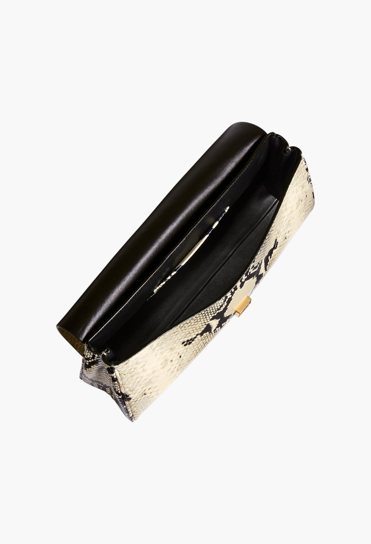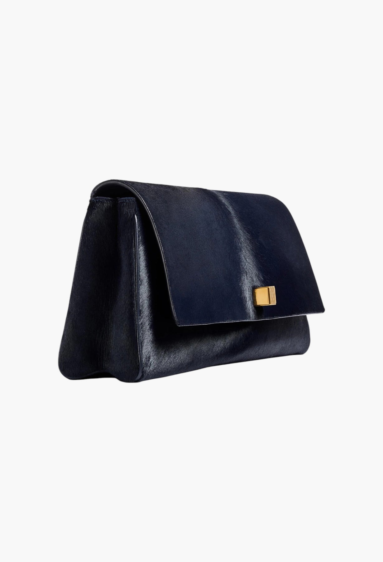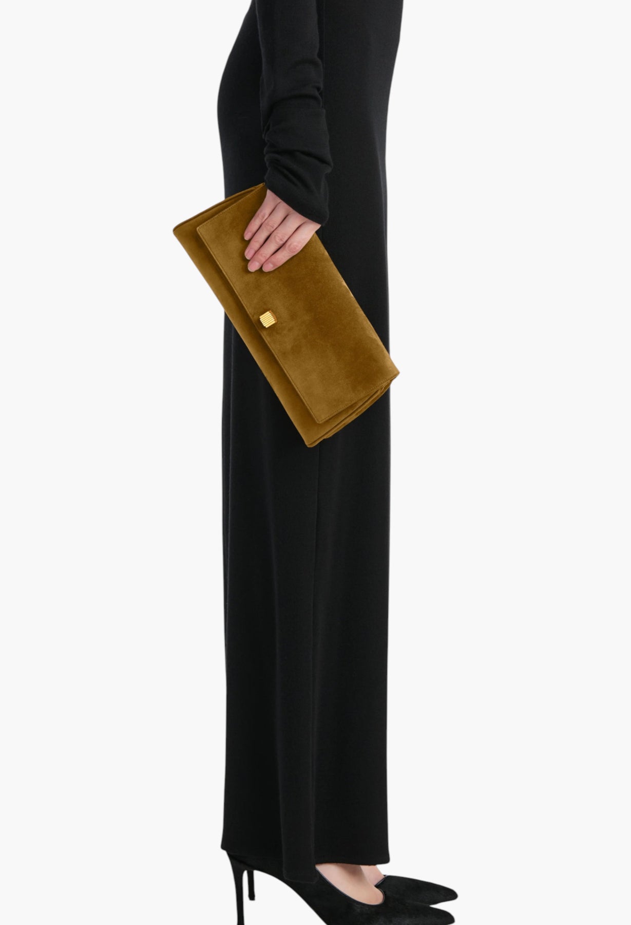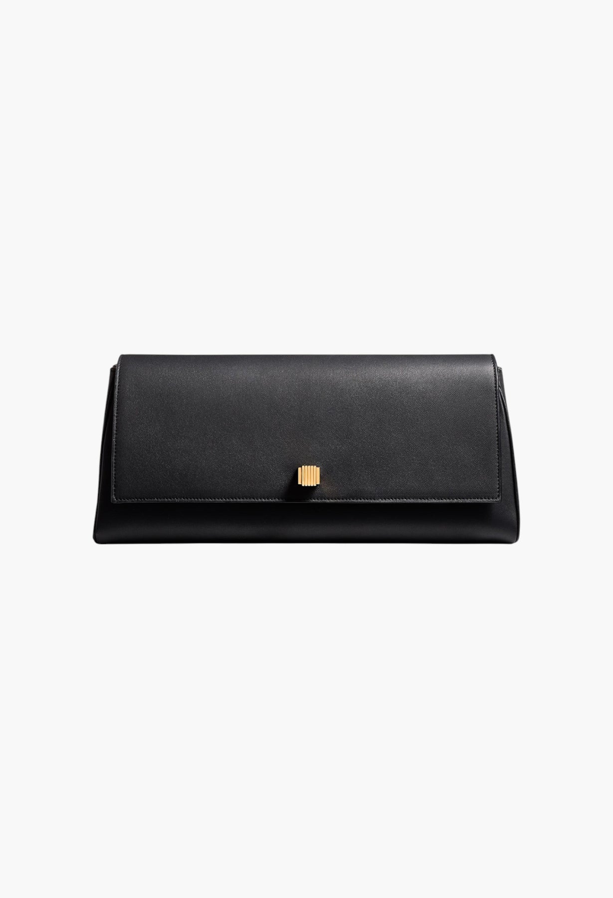 حقيبة كلاتش بغطاء أمامي، بخطوط أنيقة ومنحنيات ناعمة، مصنوعة من جلد العجل الغني بالملمس. مزودة بقفل مغناطيسي مستوحى من فن الآرت ديكو. جيب داخلي للبطاقات.