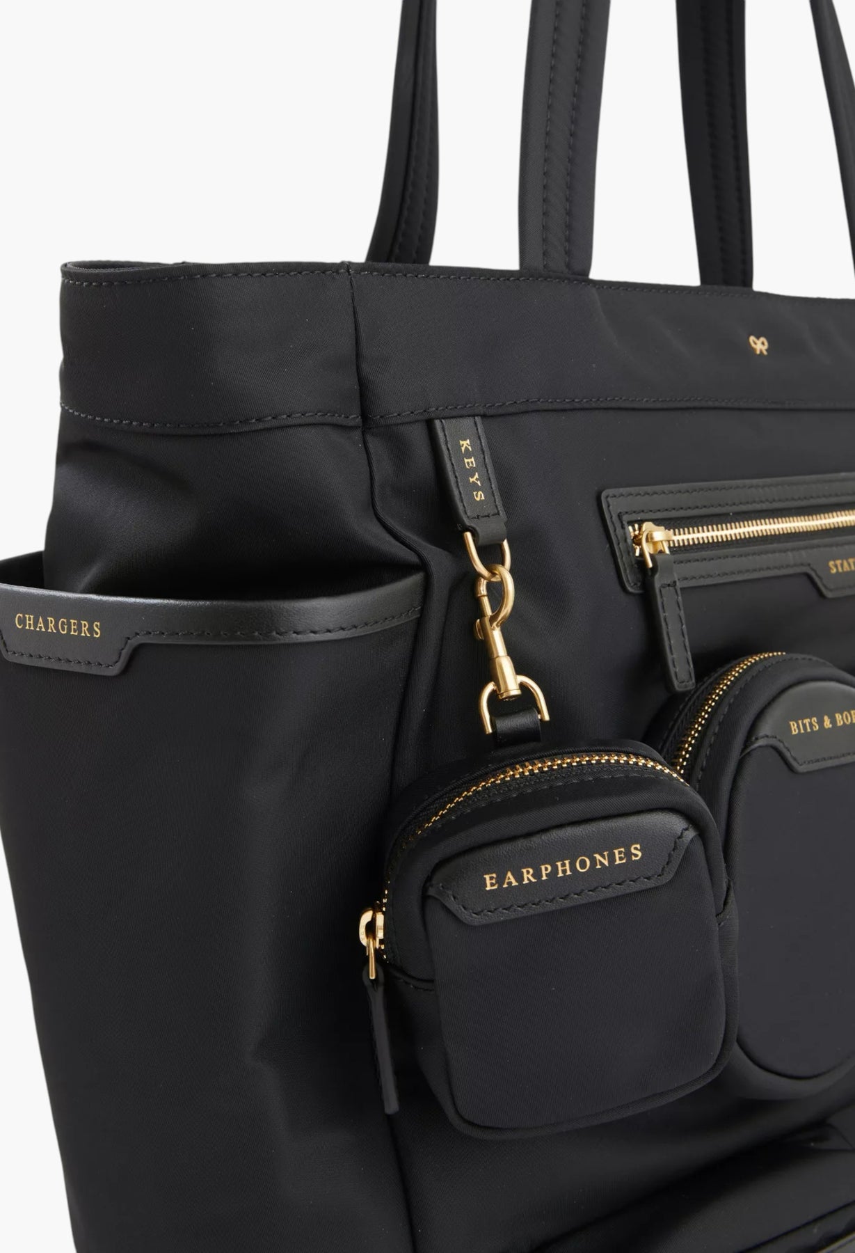 مقابض علوية مزدوجة، أجزاء معدنية تحمل العلامة التجارية في الأمام، جيوب متعددة في الأمام، حجرات منزلقة، حجرة رئيسية واحدة، جيوب منزلقة داخلية، أجزاء معدنية باللون الذهبي