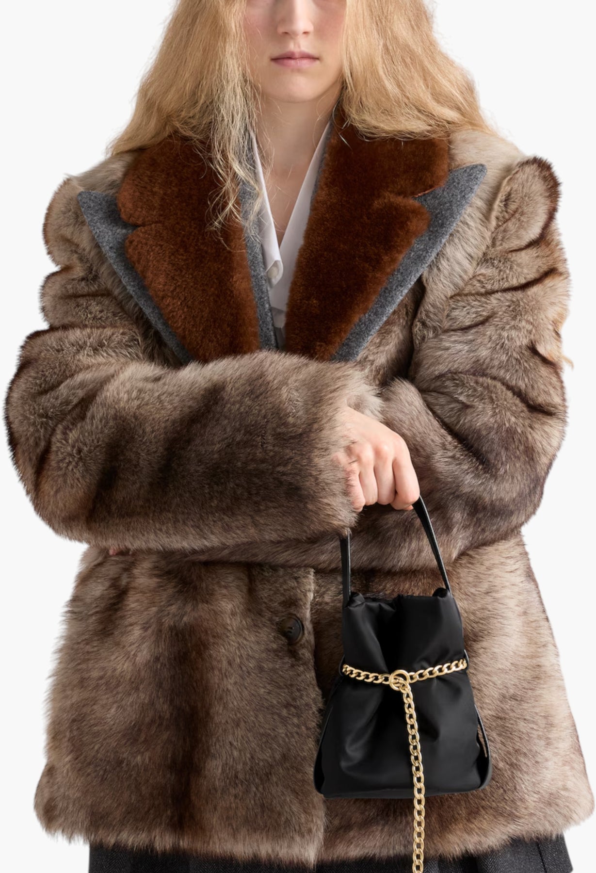 تتميز حقيبة الدلو هذه بتصميمها العصري والأنيق، بتصميمها الناعم المصنوع من النايلون المعاد تدويره، ومقبضها الجلدي. تتناغم بساطة التصميم الأنيقة مع تفاصيلها الكبيرة، كالسلسلة ذات القلادة الكروية، لتضفي عليها طابعًا راقيًا ومميزًا.