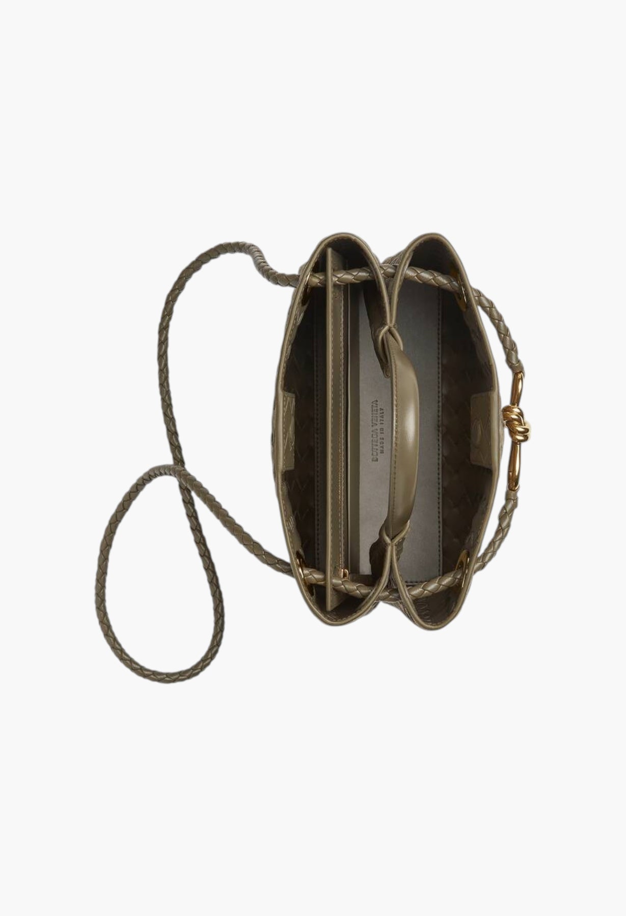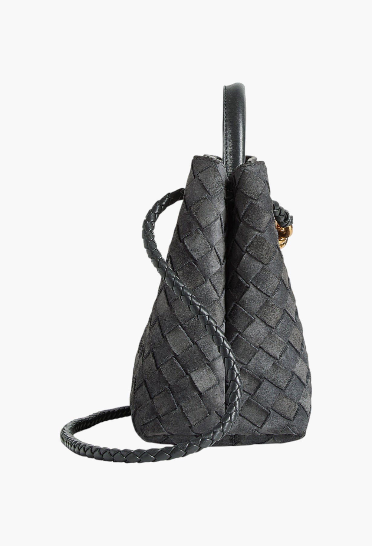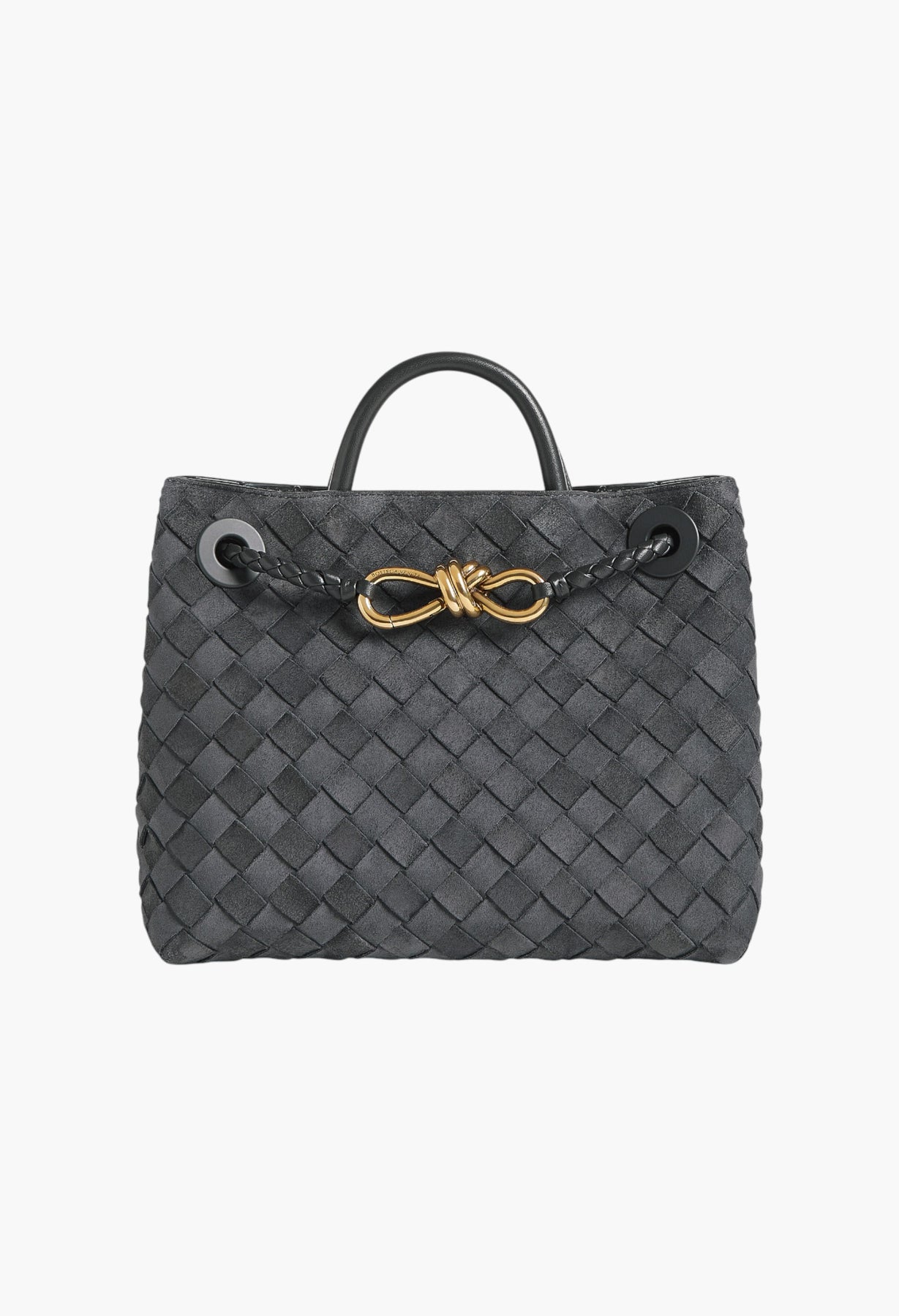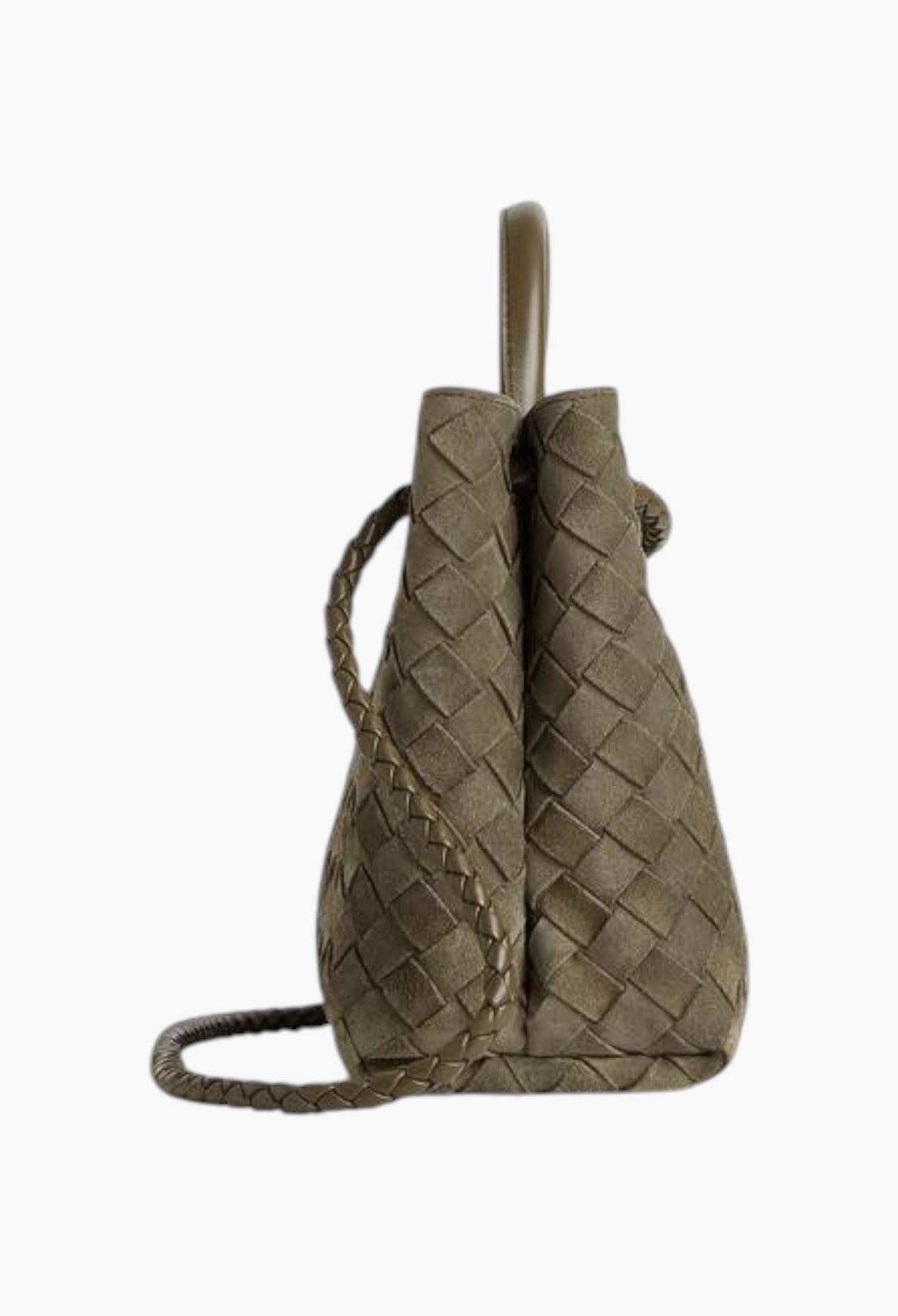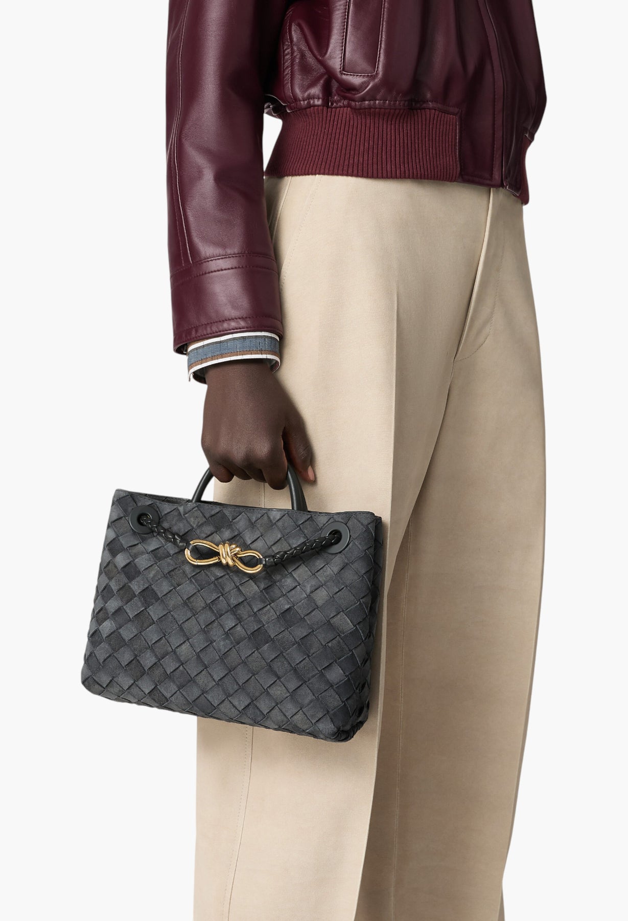 حقيبة بمقبض علوي من جلد الغزال المجدول مع تفاصيل عقدة مميزة وحزام متقاطع منزلق.