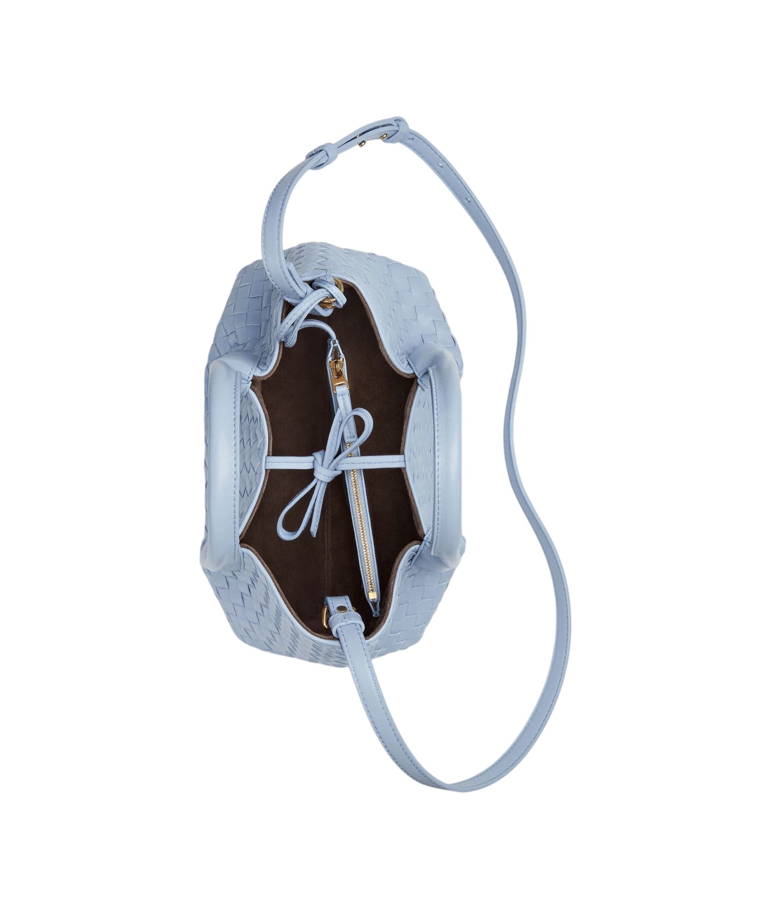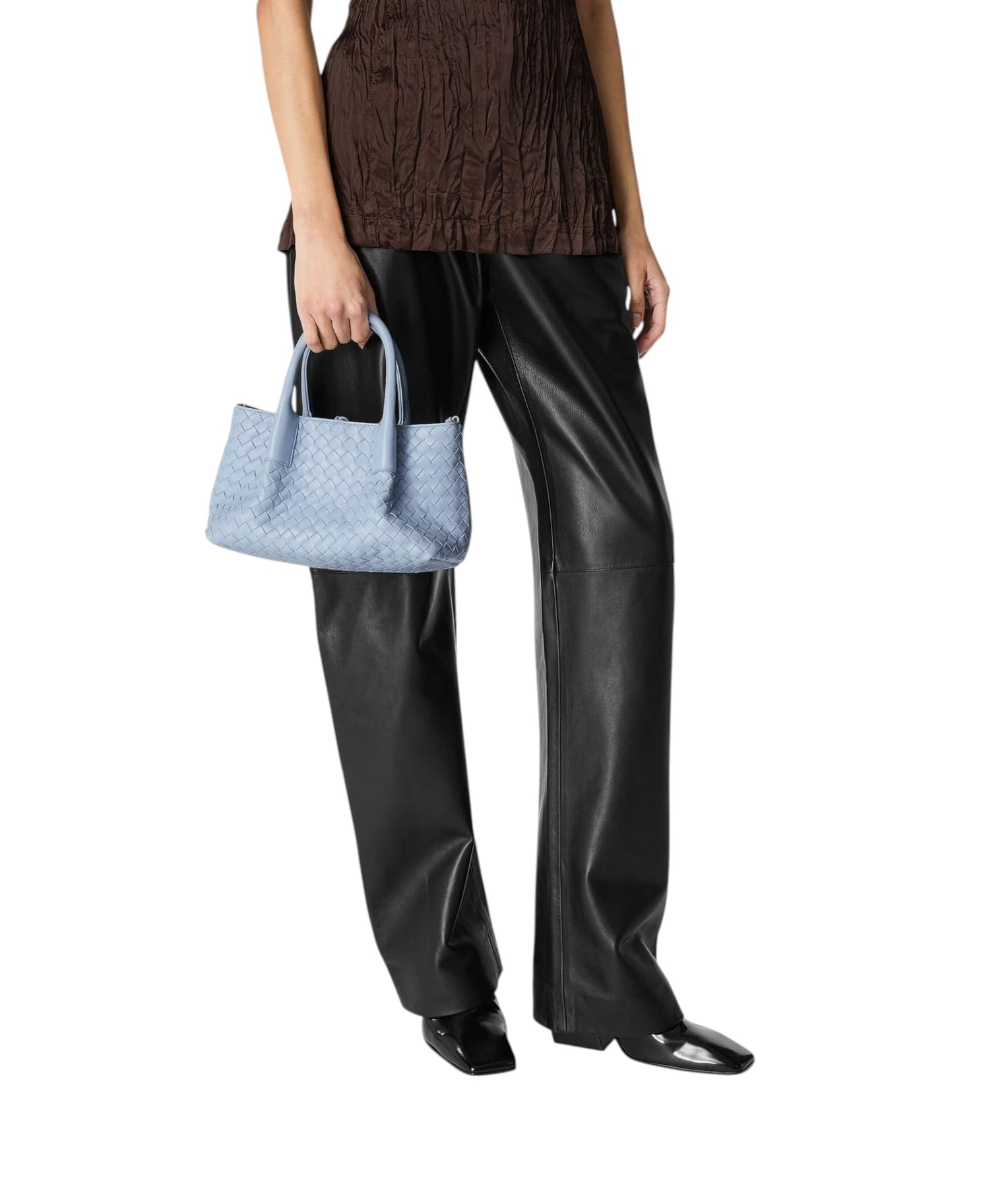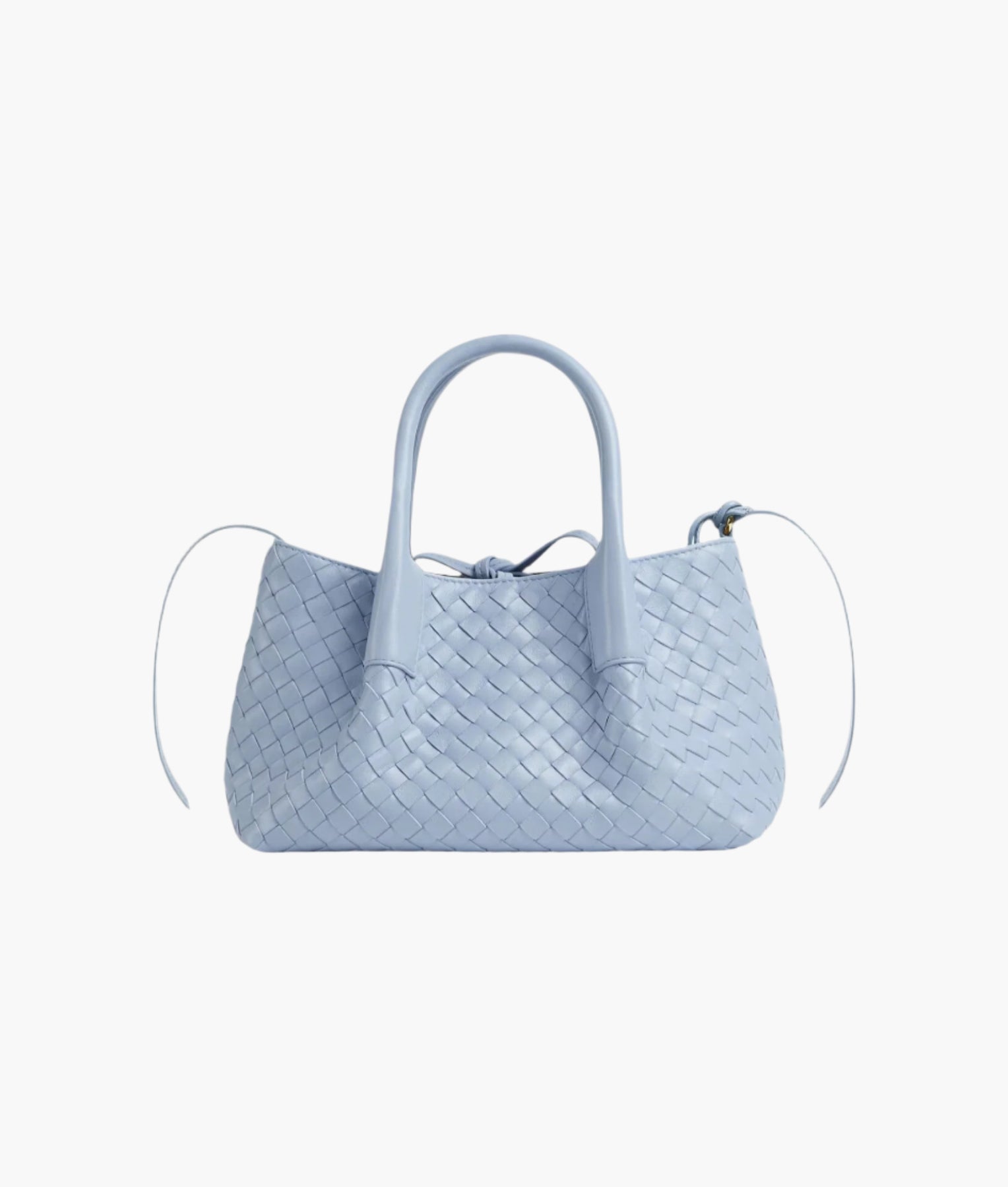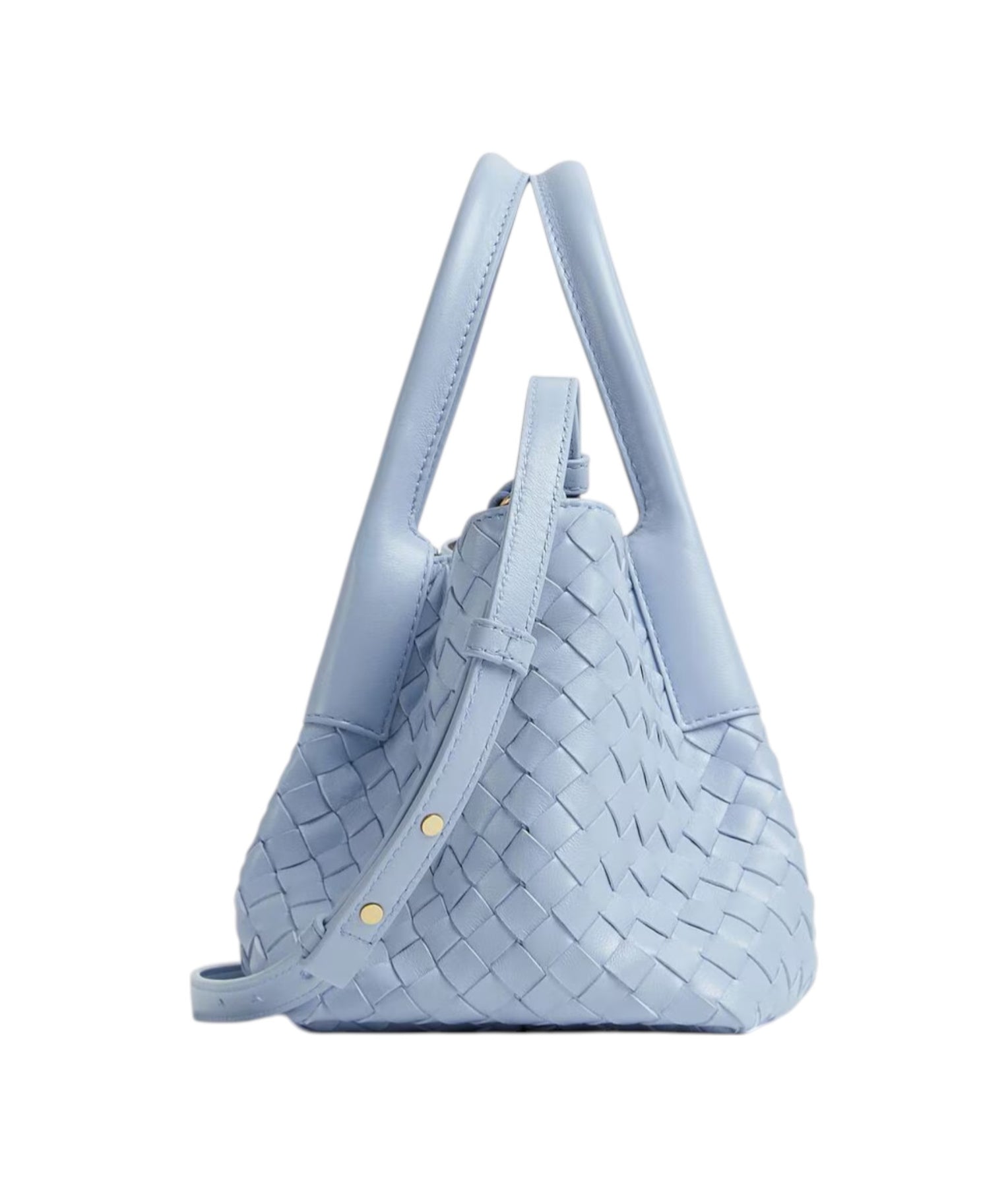 - حقيبة توت صغيرة من جلد العجل الحريري المجدول مع حزام قابل للتعديل والفصل