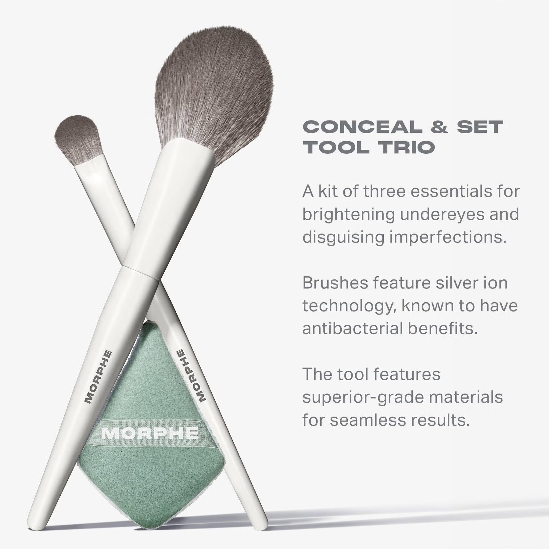 Morphe Conceal & Set Tool Trio includes three essential tools—a concealer brush, setting brush, and powder puff—crafted for seamless concealing, setting, and perfecting any makeup look.