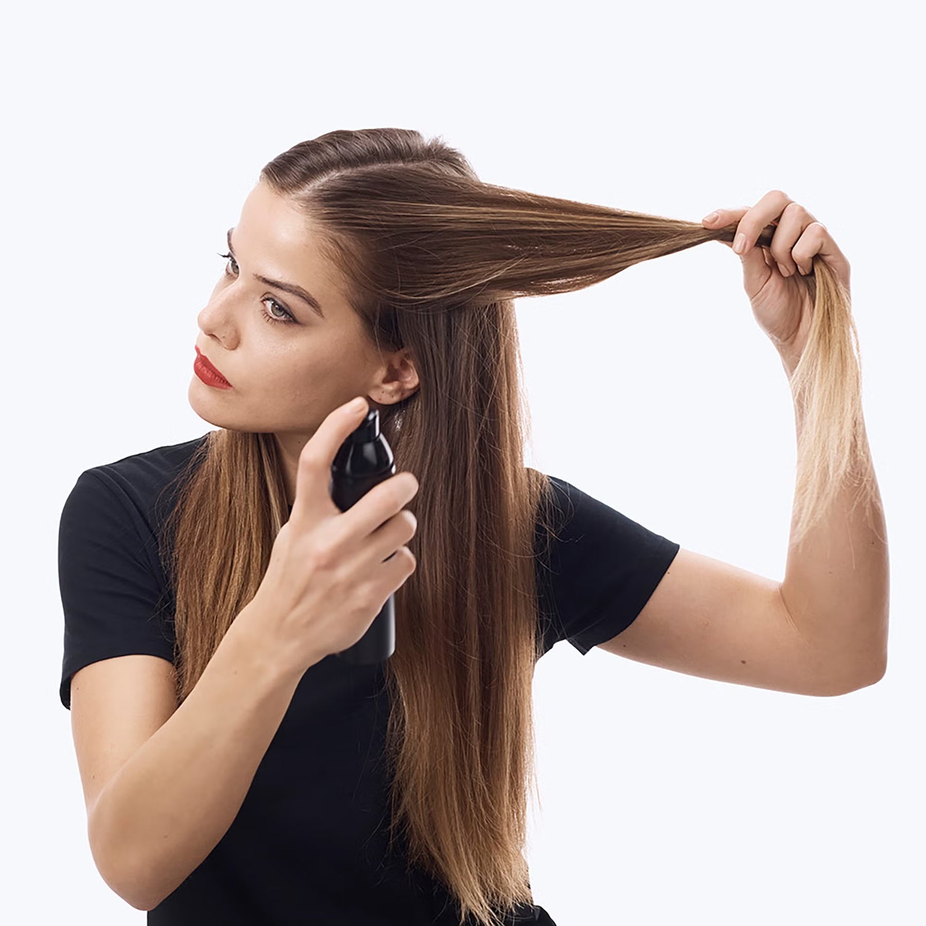 رشي المنتج على خصلات شعركِ الجافة، من الجذور إلى الأطراف. مشطي المنتج ثم صففيه بالحرارة كالمعتاد.