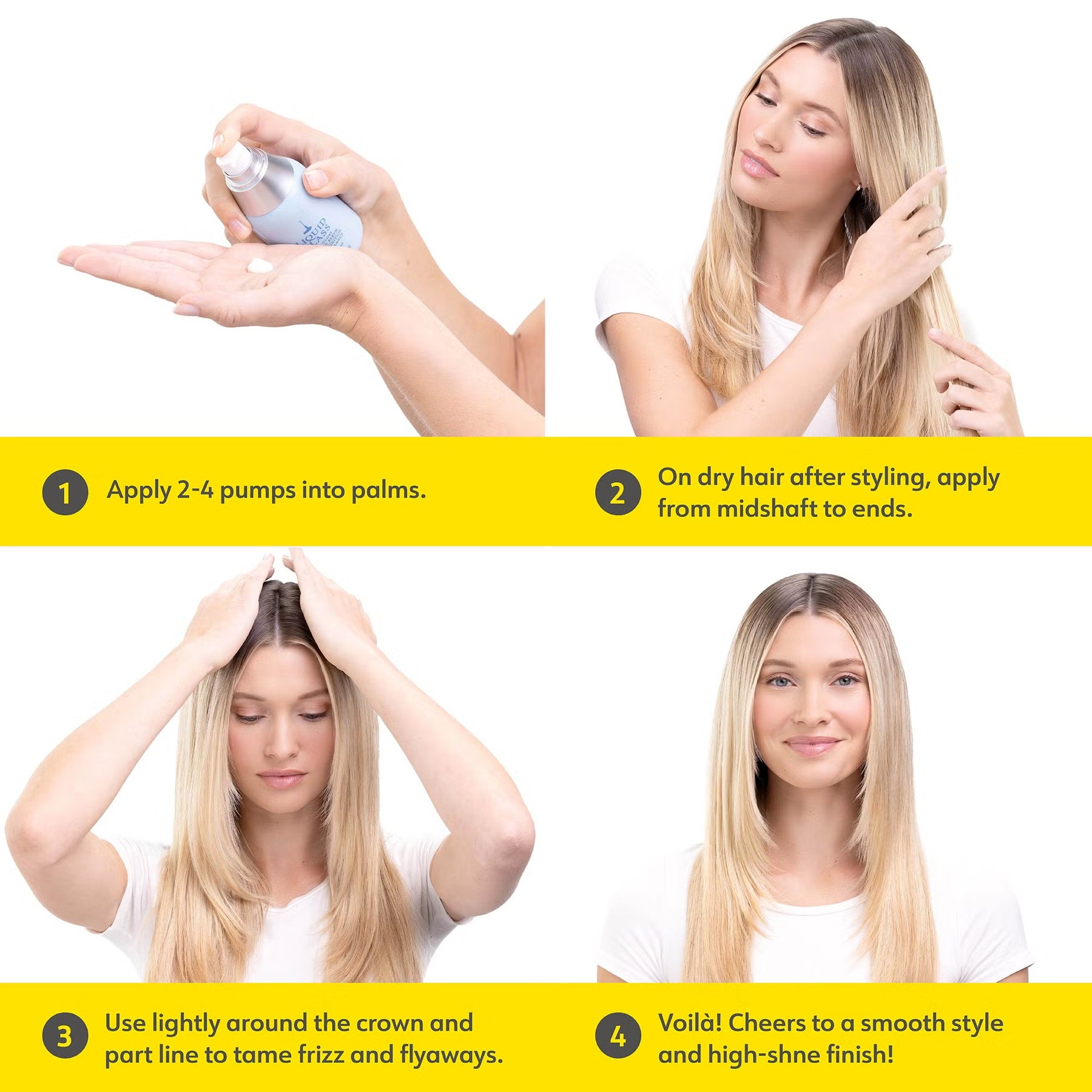 للاستخدام على الشعر الجاف. بعد التصفيف، ضعي من ٢ إلى ٤ ضغطات من منتصف الشعر حتى الأطراف. وزّعي الطبقات حسب الحاجة حسب الكثافة والطول. استخدمي كمية خفيفة حول تاج الشعر وفرق الشعر لتهدئة التجعد والشعر المتطاير. نصيحة من مصففي الشعر المحترفين: للحصول على لمعان ولمساعدة على فصل التموجات والتجعيدات، ضعي كمية بحجم عملة معدنية صغيرة في راحة يدكِ ومرريها على شعركِ.