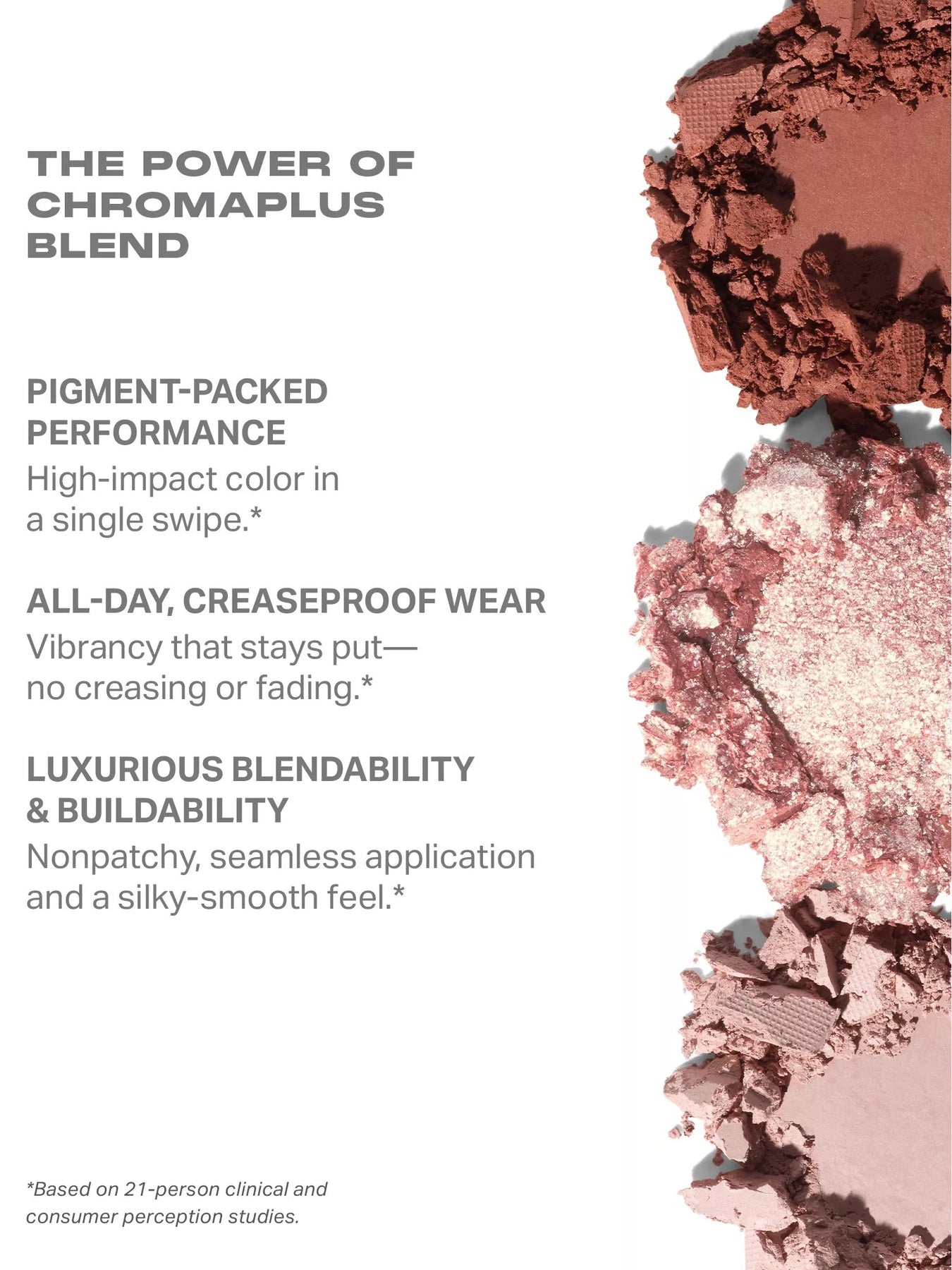 الفوائد: مدعومة بمزيج ChromaPlus المتطور، توفر تركيبات الظل الجديدة هذه أداءً غنيًا بالصبغة بلمسة واحدة وارتداءً مقاومًا للتجاعيد طوال اليوم، بما في ذلك الألوان الناعمة الحريرية والقابلة للمزج بشكل فاخر، واللمعان، والمعدنيات التي تبني الأبعاد من أجل تعبير سهل، بالإضافة إلى ظلال العيون المعدنية شديدة الانعكاس والتي يمكن تطبيقها جافة للحصول على تأثيرات مضيئة ومنتشرة أو مبللة للحصول على لمعان مفصل يشبه الذوبان.