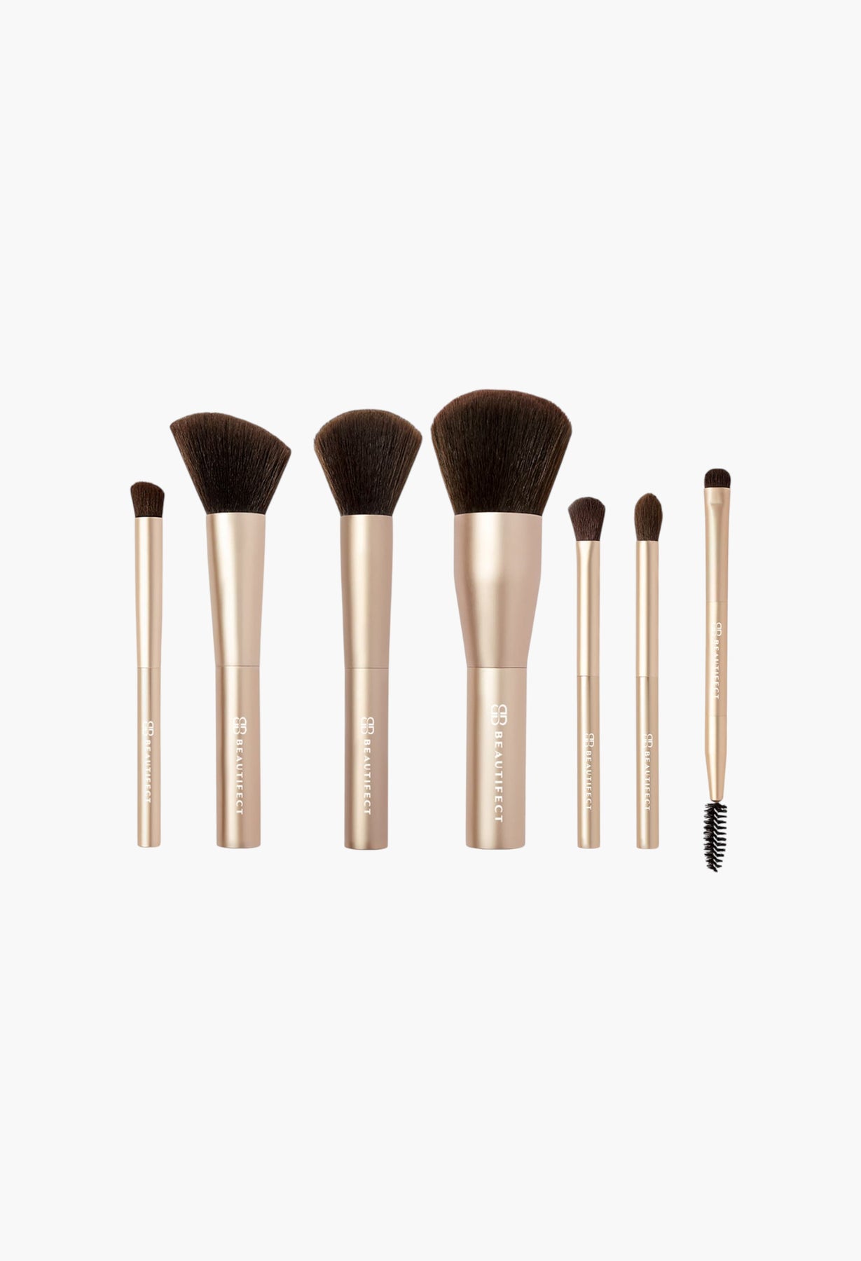 - تتضمن فرشاة تحديد الوجه، وفرشاة أحمر الخدود، وفرشاة البودرة، وفرشاة الكونسيلر، وفرشاة ظلال العيون، وفرشاة ذات طرفين