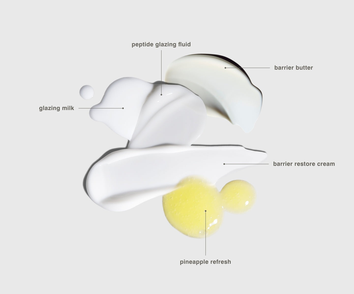 تحتوي على 5 منتجات: Little Pineapple Refresh (40 مل / 1.35 أونصة سائلة)، Little Glazing Milk (65 مل / 2.2 أونصة سائلة)، Little Peptide Glazing Fluid (15 مل / 0.5 أونصة سائلة)، Little Barrier Restore Cream (30 مل / 1.0 أونصة سائلة)، و Little Barrier Butter (40 مل / 1.35 أونصة سائلة)