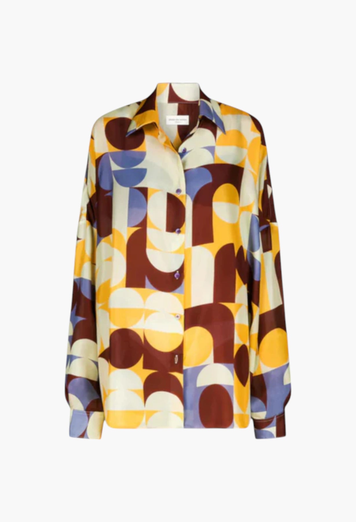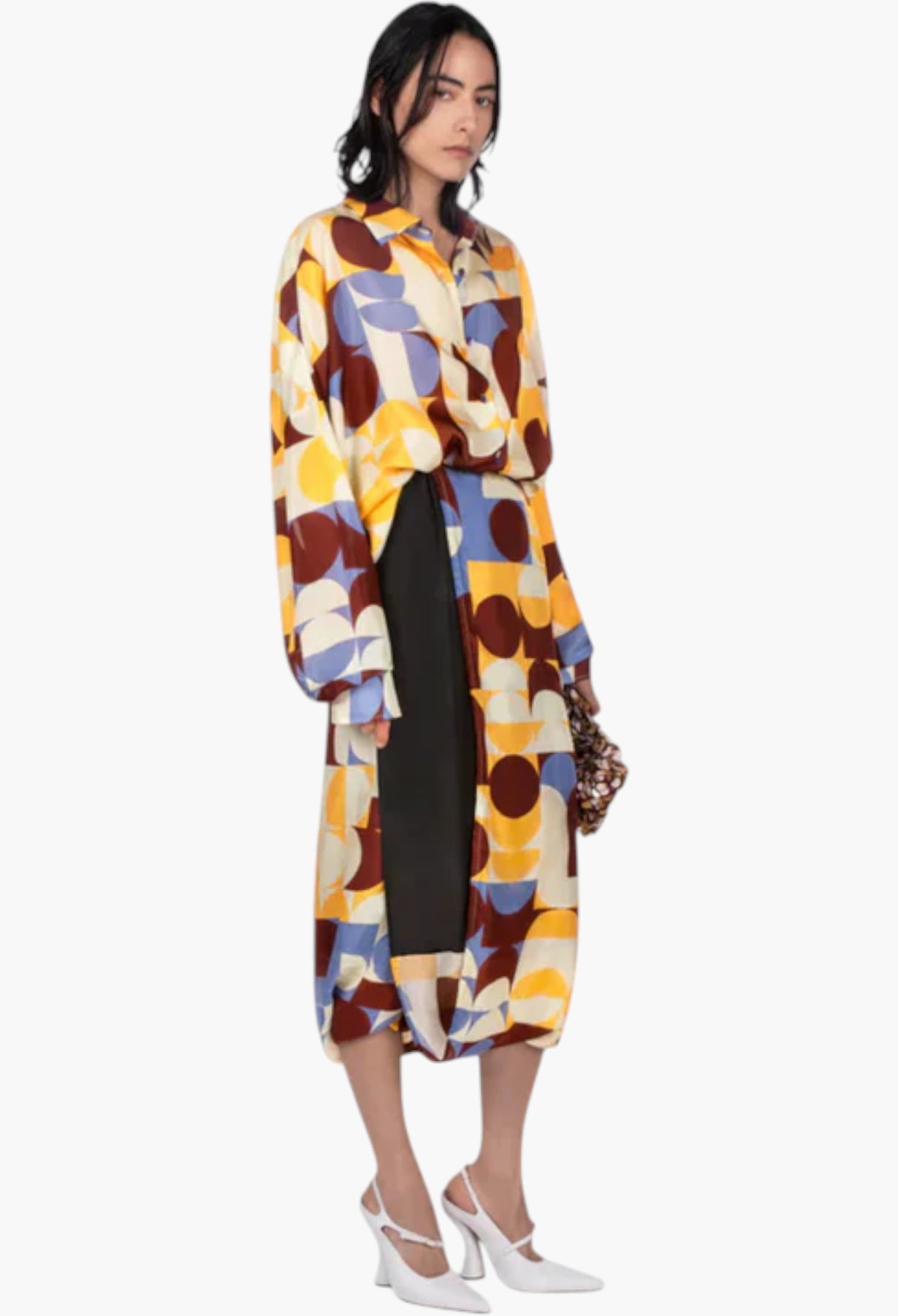 قميص شرنقة كبير الحجم مع كتف منسدل، من الحرير المطبوع.