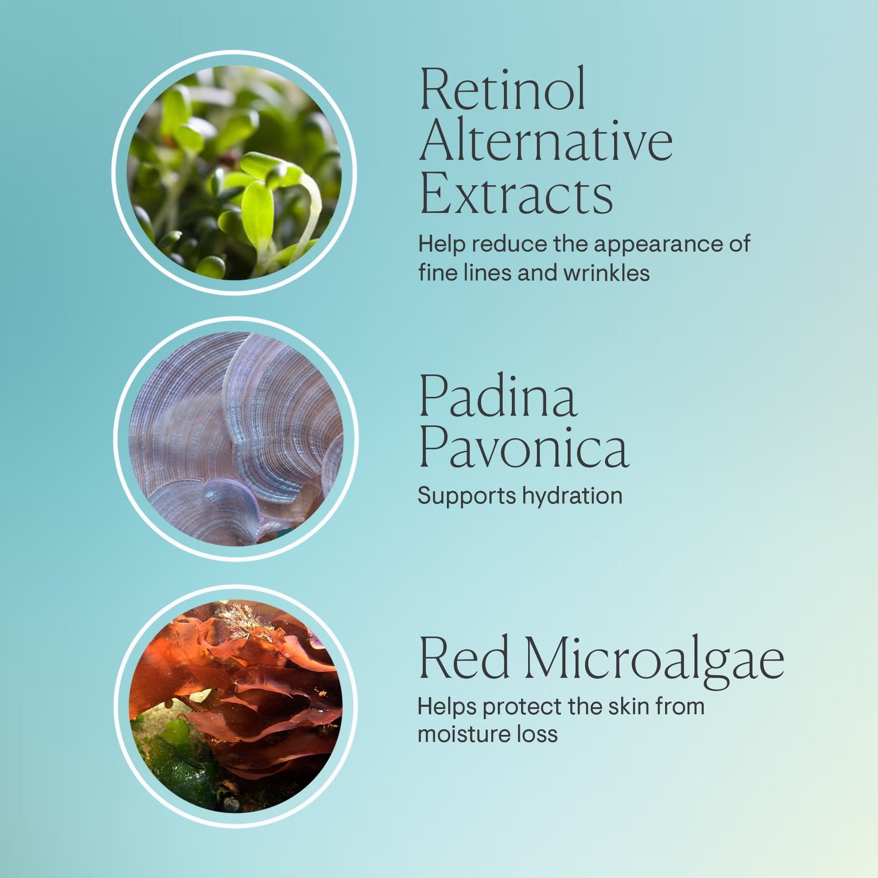 هذا المزيج من المكونات المتطورة ضروري لبشرة مشدودة ورطبة، فهو يستخدم بادينا بافونيكا (لتحسين مرونتها وجذب الرطوبة)، والطحالب الحمراء الدقيقة (مضاد أكسدة قوي لحماية البشرة وتعزيز نعومتها)، وبدائل الريتينول الطبيعية مثل البرسيم الحجازي والستيفيا، التي تستخدم فيتامين أ لتحسين ملمس البشرة ولونها، مما يقلل من ظهور التصبغات. إذا كنتِ تبحثين عن بشرة شابة وممتلئة دون أي آثار جانبية كالجفاف أو الاحمرار أو التهيج، فقد وجدتِ ما تبحثين عنه.