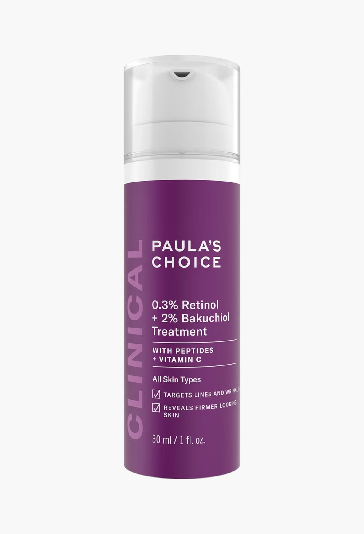 هنا لتقليل ظهور الخطوط الدقيقة واستعادة مرونة البشرة وتوحيد لونها، يوجد علاج Paula's Choice Clinical 0.3% Retinol + 2% Bakuchiol (30 مل).