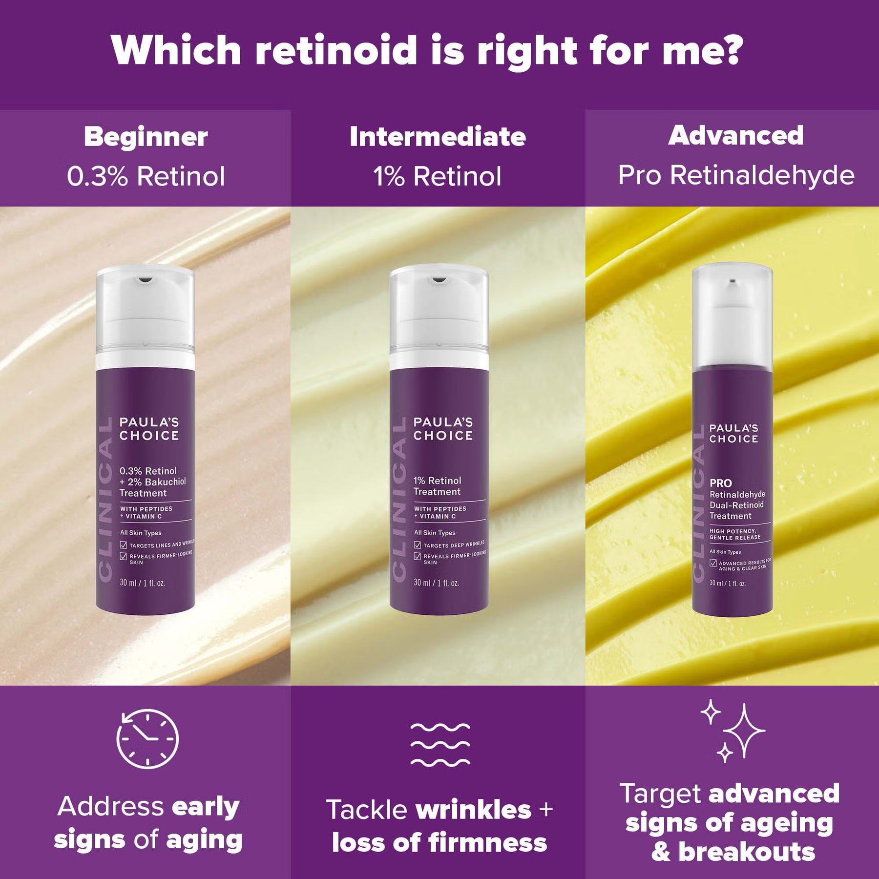 ضعي كمية بحجم حبة البازلاء بعد تنظيف البشرة وترطيبها وتقشيرها، ثم ضعي سيرومك و/أو مرطبك الليلي. تجنبي ملامسة الشفاه، أو ملامسة العينين مباشرةً، أو زوايا العينين. يمكنكِ وضع المنتج حتى عظمة العين. عند استخدام الريتينول السريري 1% لأول مرة، ابدئي بثلاث ليالٍ أسبوعيًا كحد أقصى، ثم زيدي وتيرة الاستخدام تدريجيًا إلى ليلتين، وأخيرًا كل ليلة حسب قدرة بشرتكِ على التحمل.