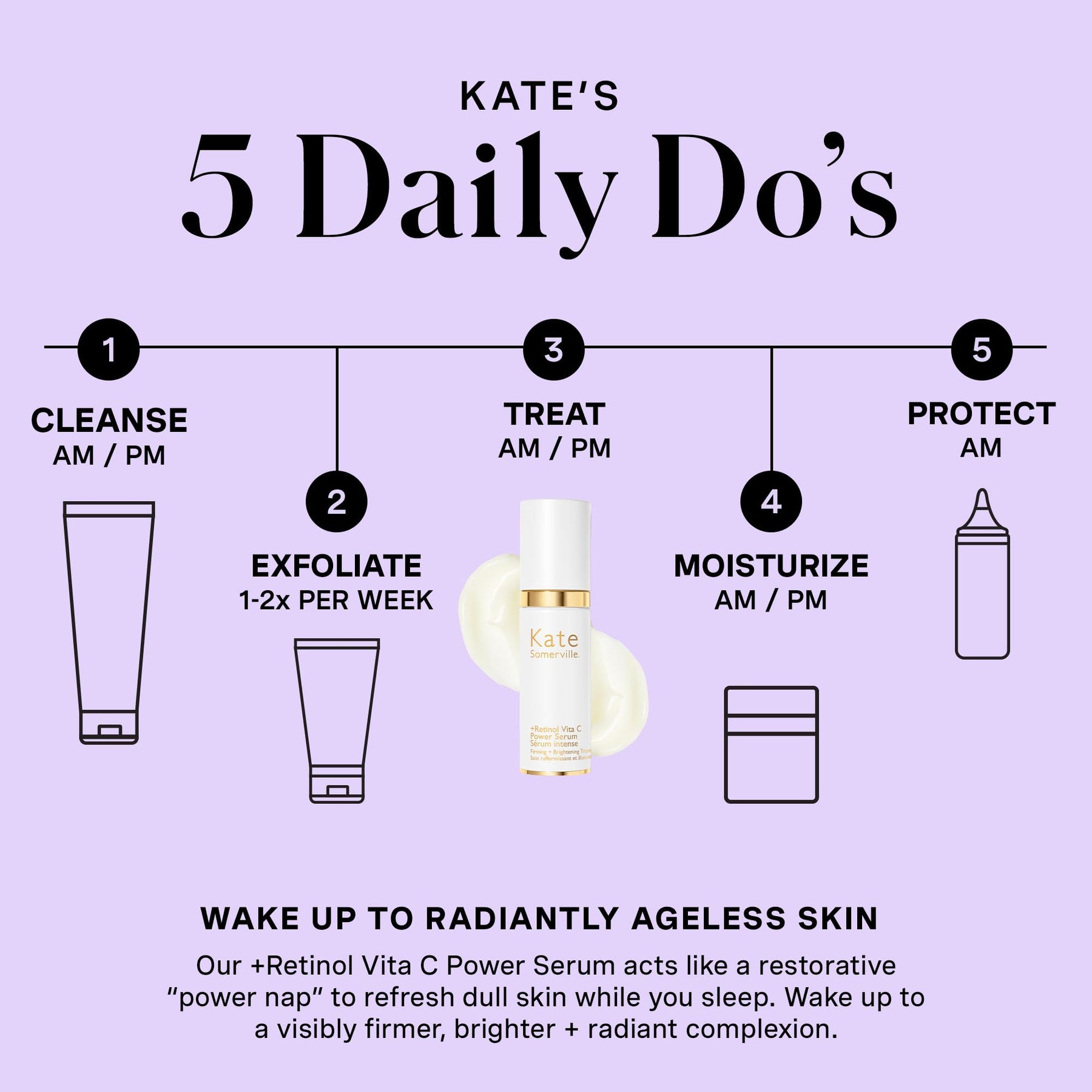 في الليل، ضعي طبقة رقيقة ومتساوية على الوجه والرقبة، مع تجنب منطقة العينين. ثم استخدمي مرطب كيت سومرفيل المفضل لديكِ. لا تجمعي منتجات ريتينول متعددة في نفس الوقت.