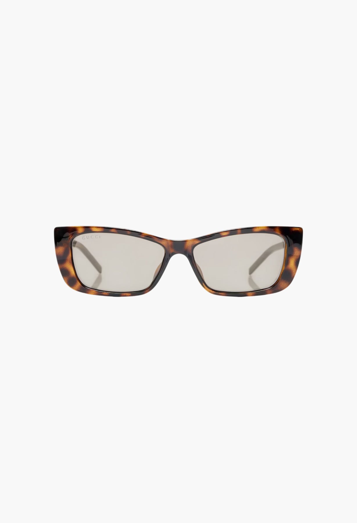 صُنعت هذه النظارات الشمسية من غوتشي في إيطاليا، وتتميز بشعار العلامة التجارية المُزخرف على جانبي الإطار. تتميز بشكل مستطيل ذي انحناءات دقيقة عند الحواف.