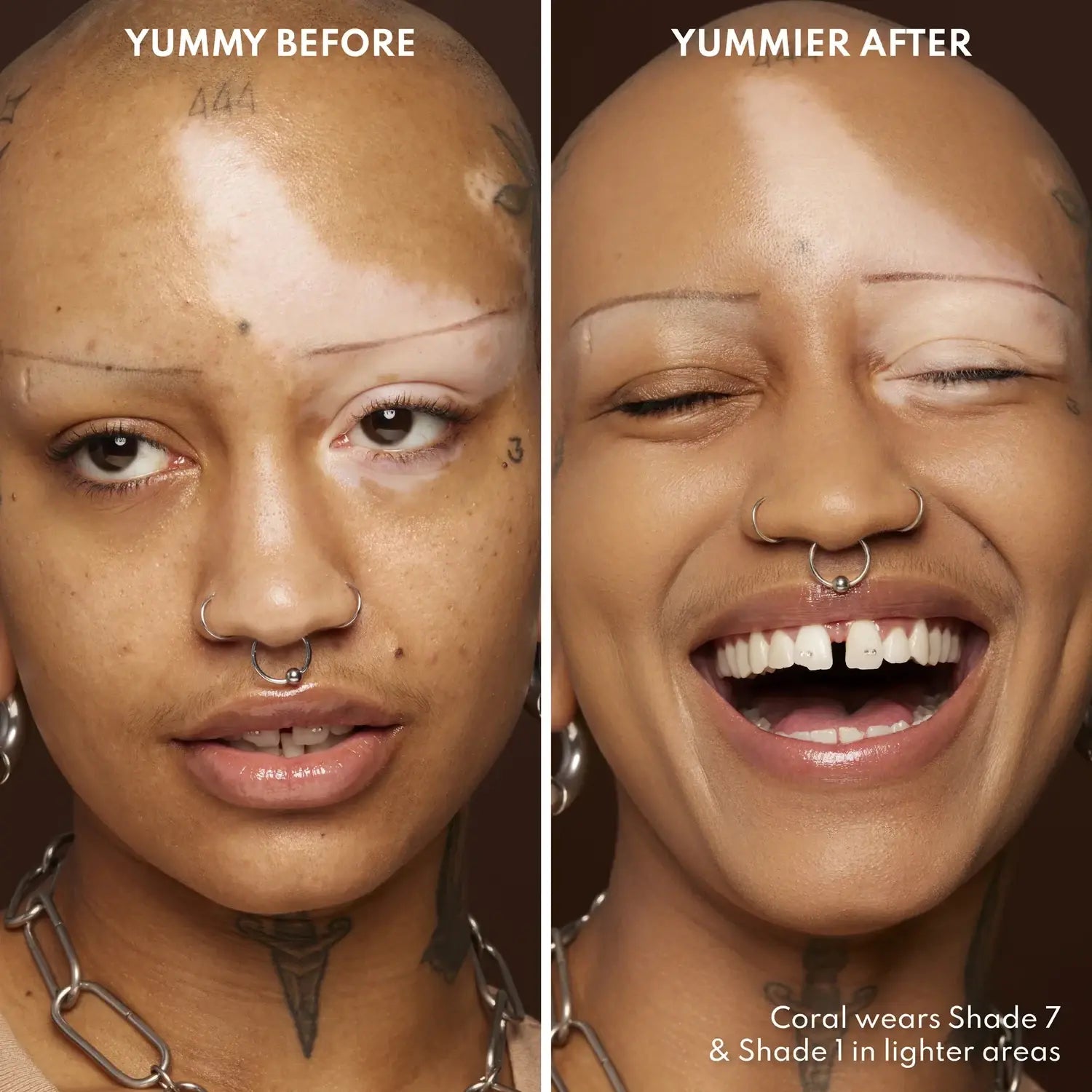 To highlight and contour: Using a tinted shade at least two shades lighter or deeper than your skin tone, apply with fingers or a brush to brighten and sculpt.