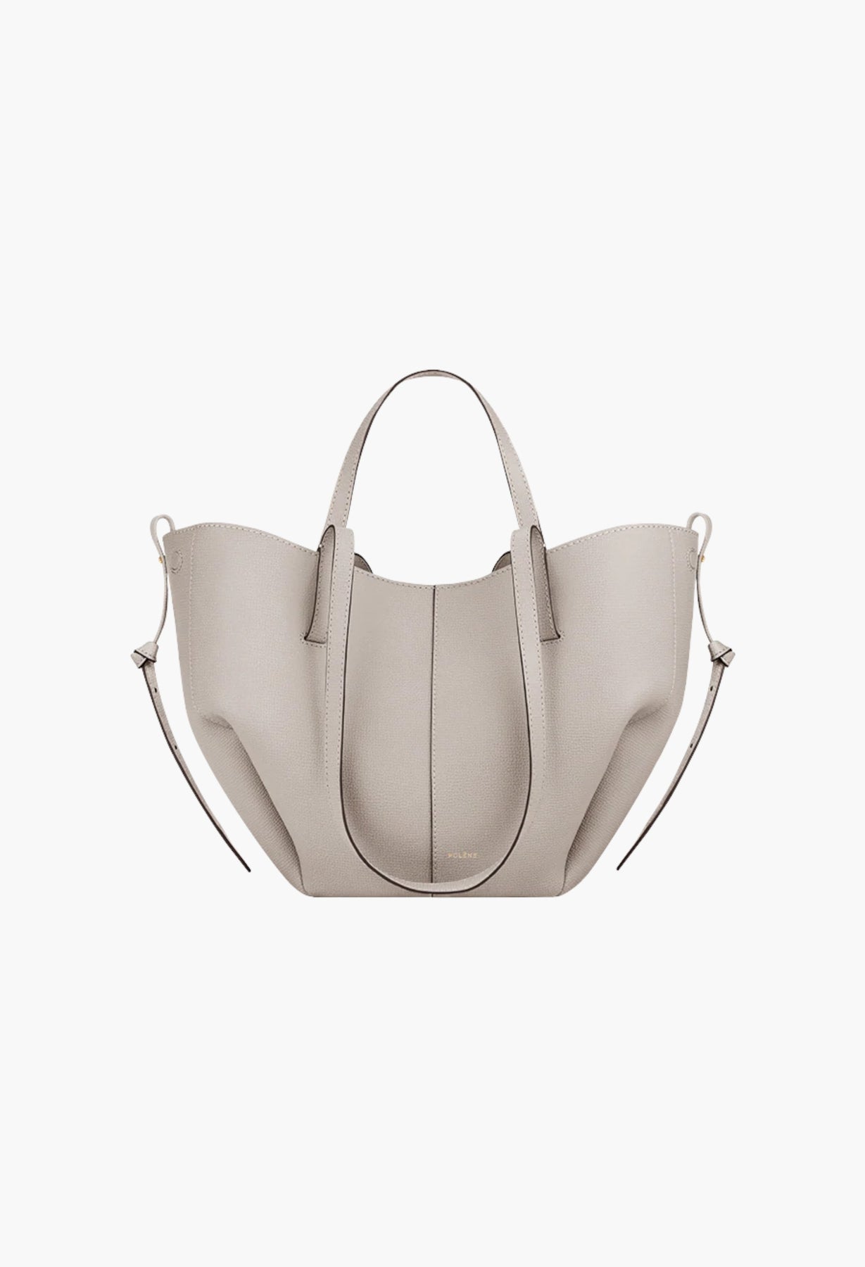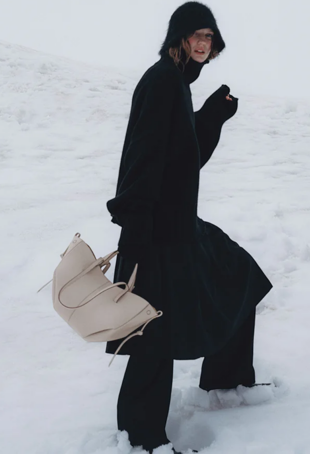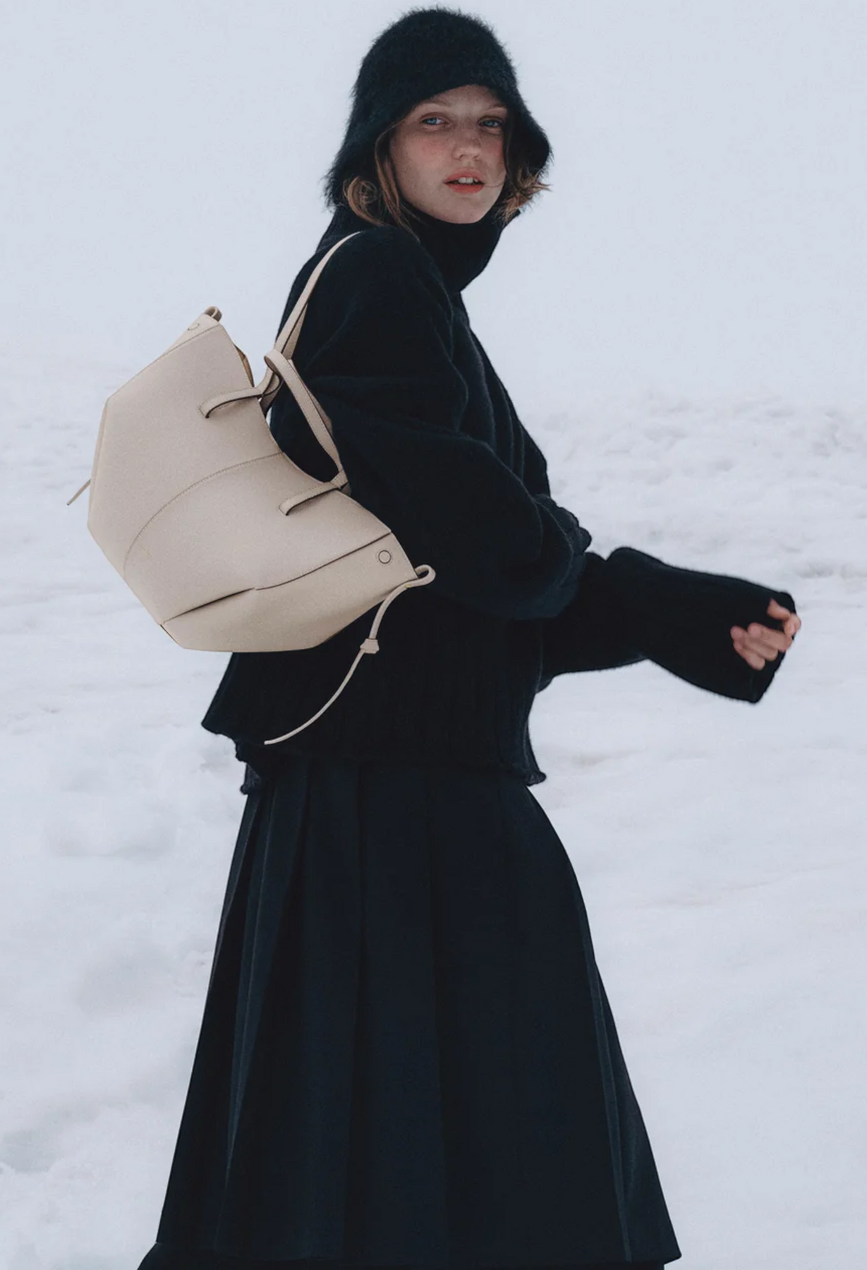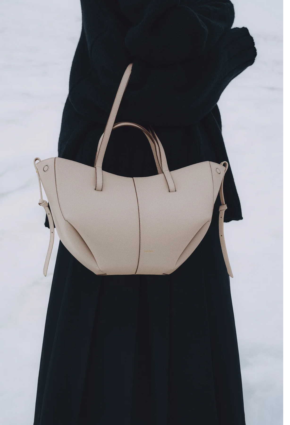 This compact sculptured tote bag featuring waves, folds, and curves can be used in two ways. The first is a basket, its sides open, its straps on the outside. The second is a floral, closed bag, its sides tucked in, its straps crossing on the inside. Its name was inspired by the French word “cime”, meaning a peak or mountain crest, in reference to the ridge running along it. Dimensions: 22 x 33 x 13 cm
