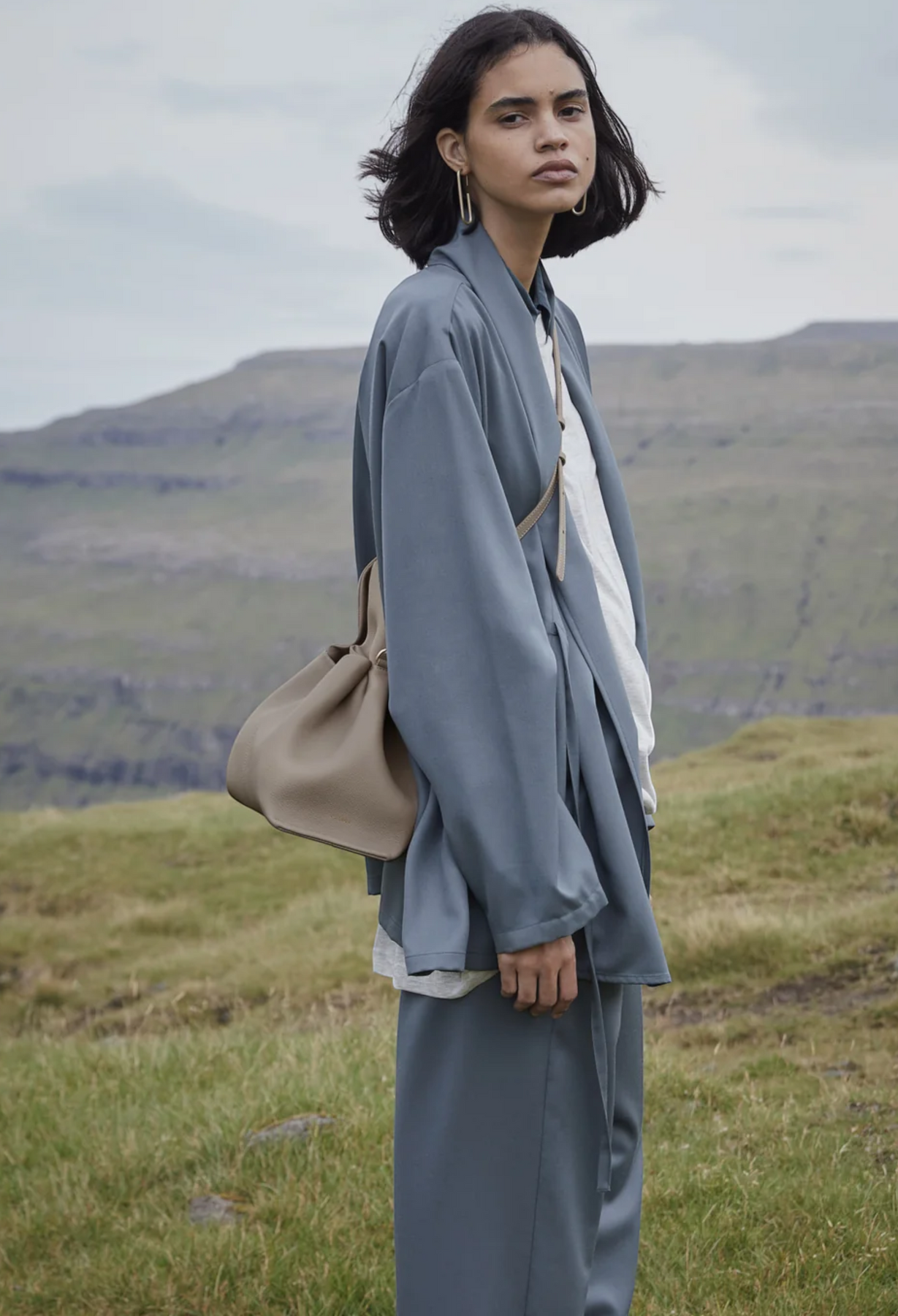 The “Numéro Neuf” features an organic design that strikes the right balance between flexibility and hold. Its draped leather is held in place by hand-sewn stitches. Dimensions: 20 x 32 x 16 cm