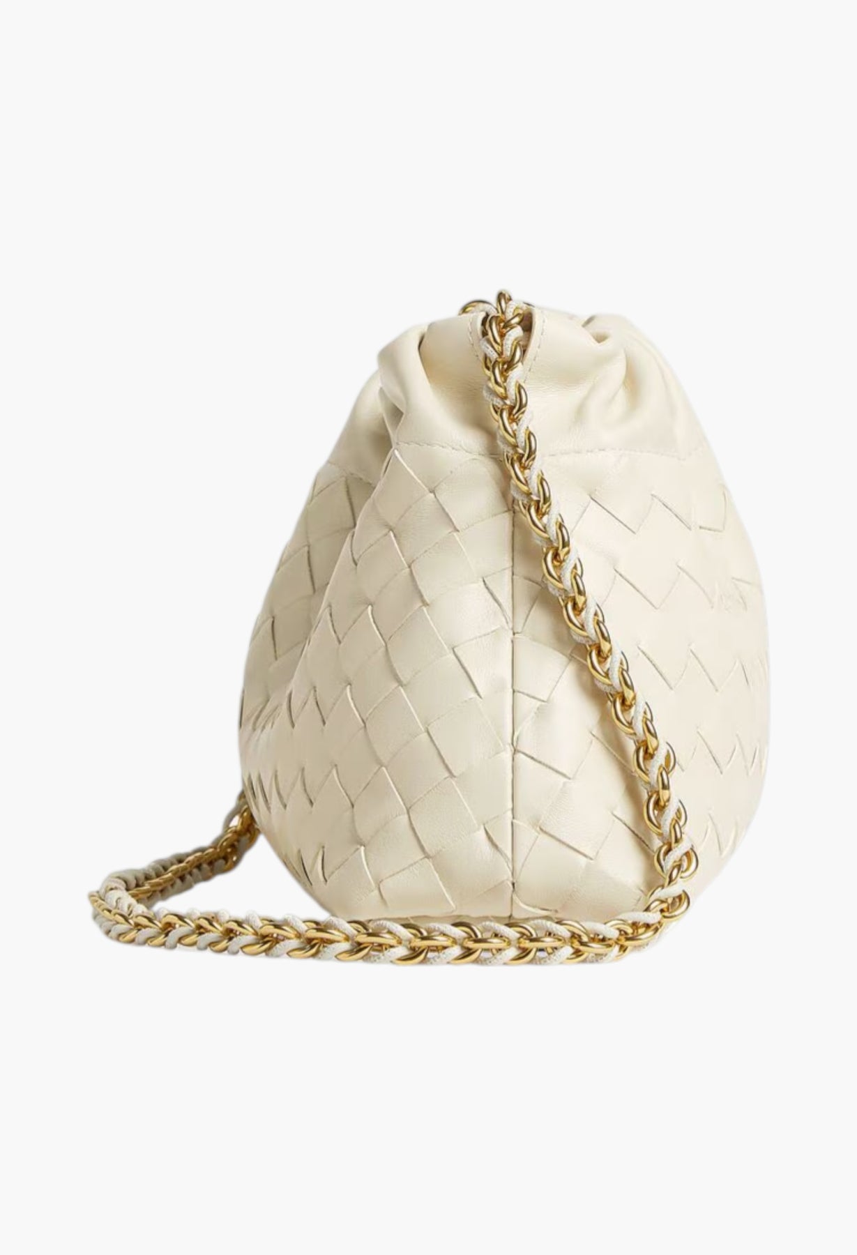 حقيبة غبار من جلد العجل المجدول مع سلسلة معدنية أنبوبية مضفرة. مزودة بقفل شد وحلقة للحمل على الكتف.