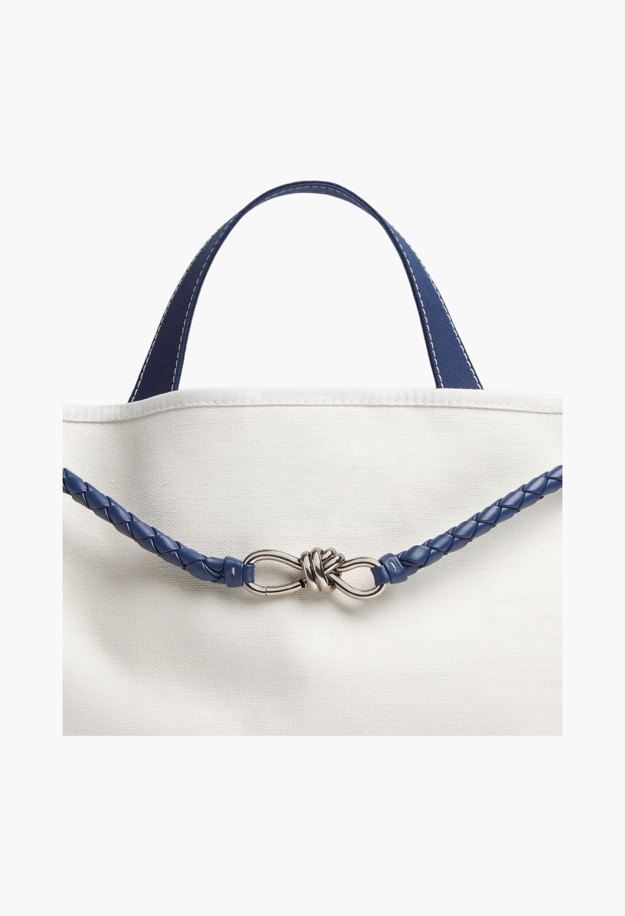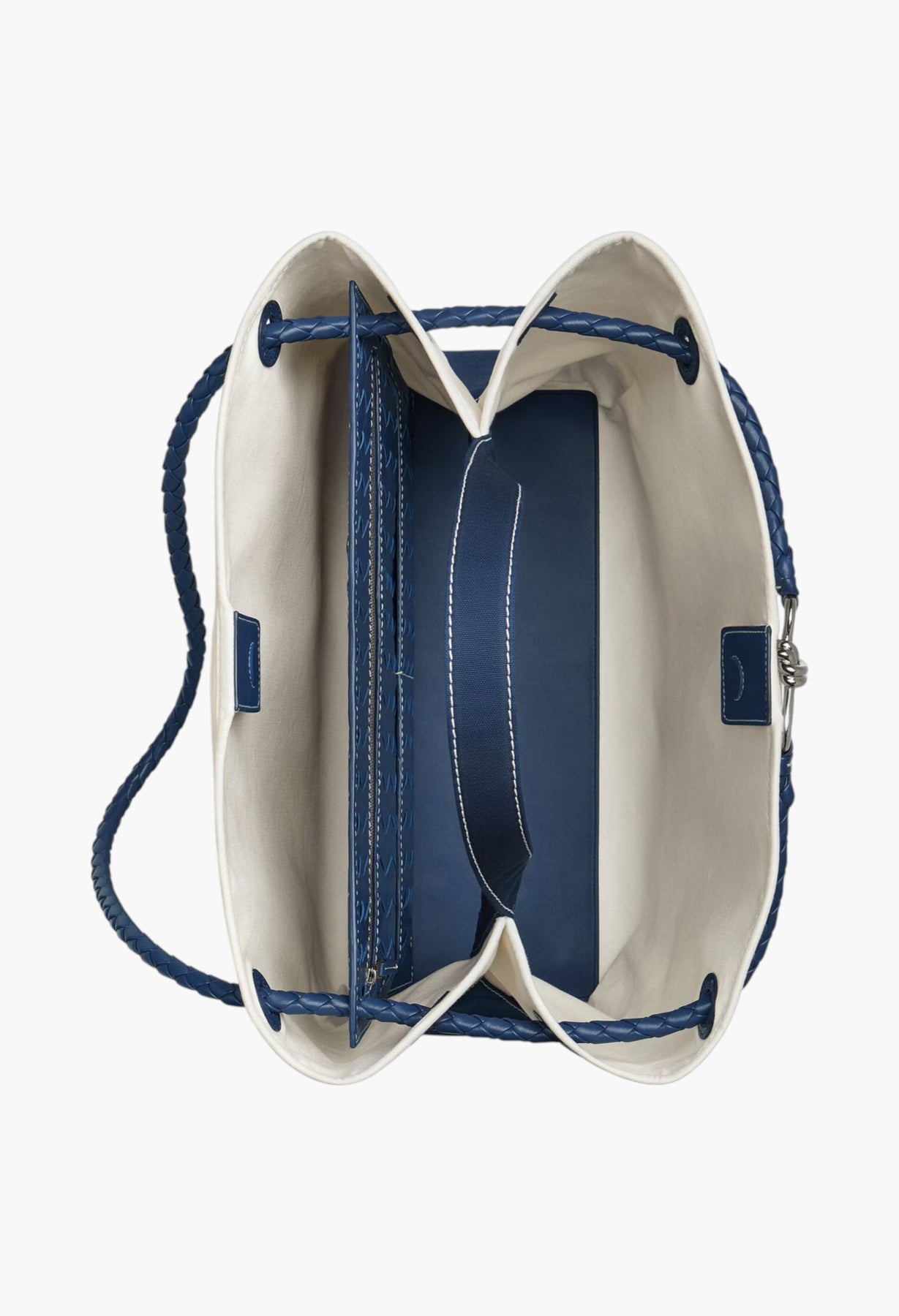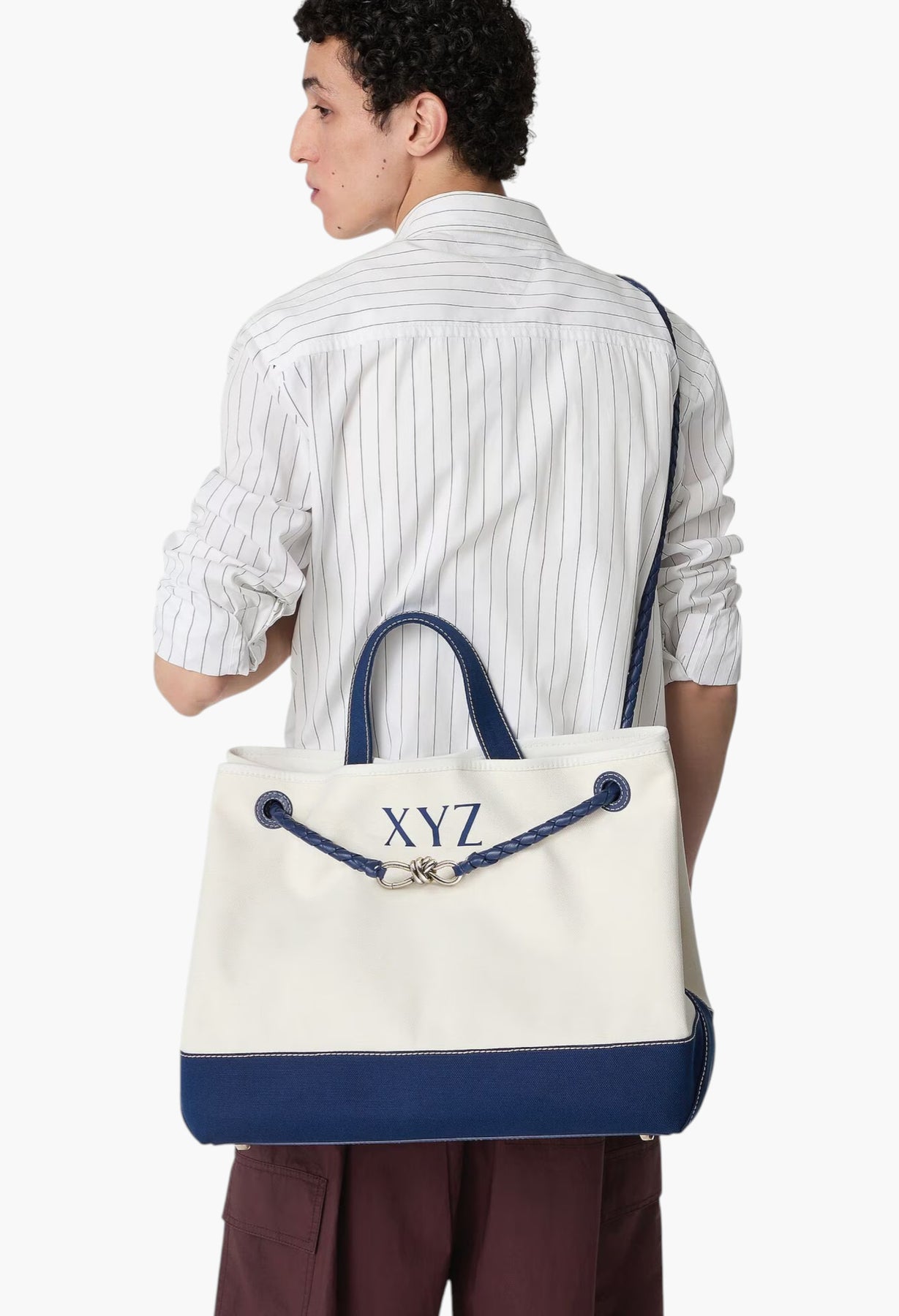 حقيبة بمقبض علوي من قماش ثنائي اللون مع تفاصيل عقدة مميزة وحزام جلدي منزلق عبر الجسم.
