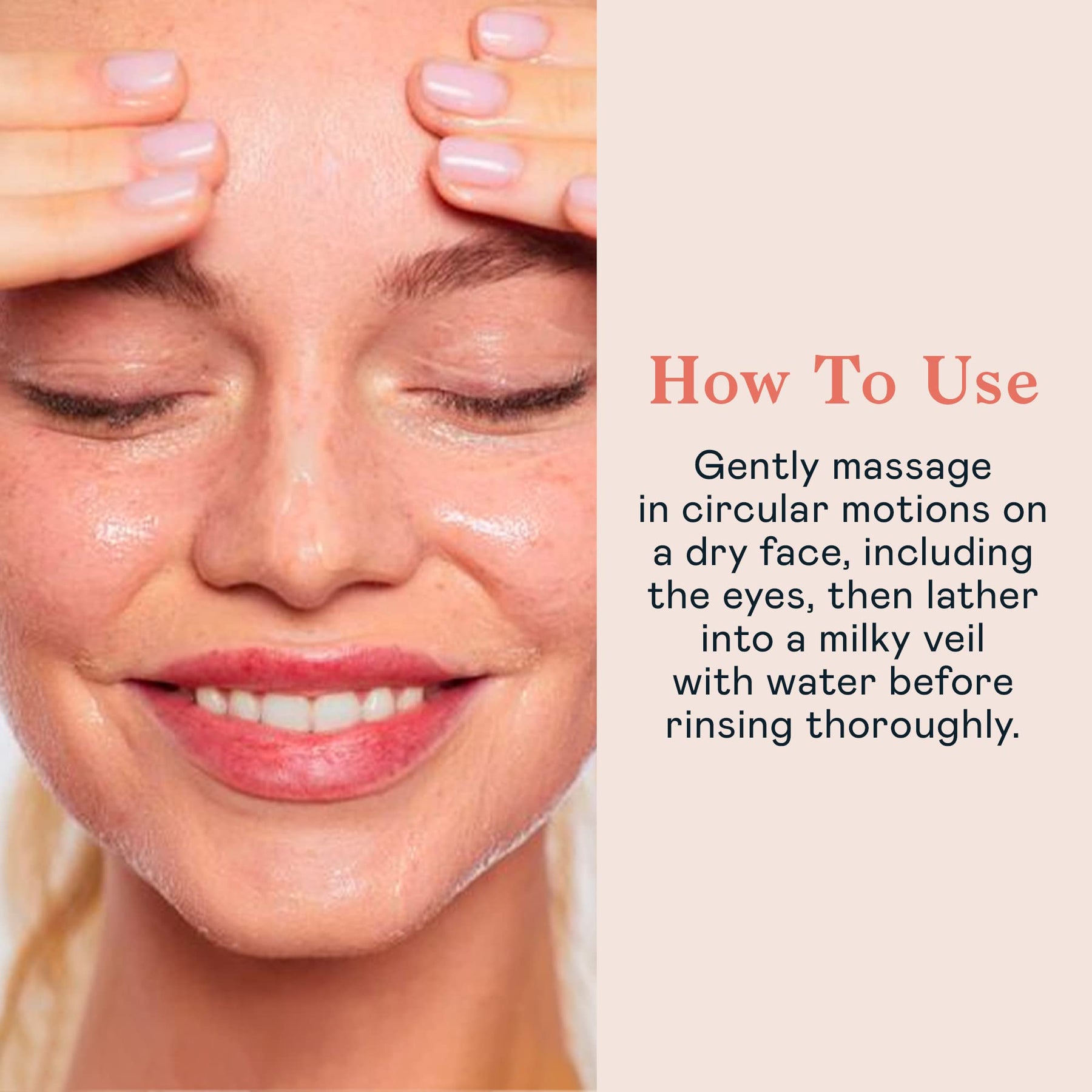 | دلكي بلطف بحركات دائرية على الوجه الجاف، بما في ذلك العينين، ثم دلكيها في حجاب حليبي بالماء قبل الشطف جيدًا |