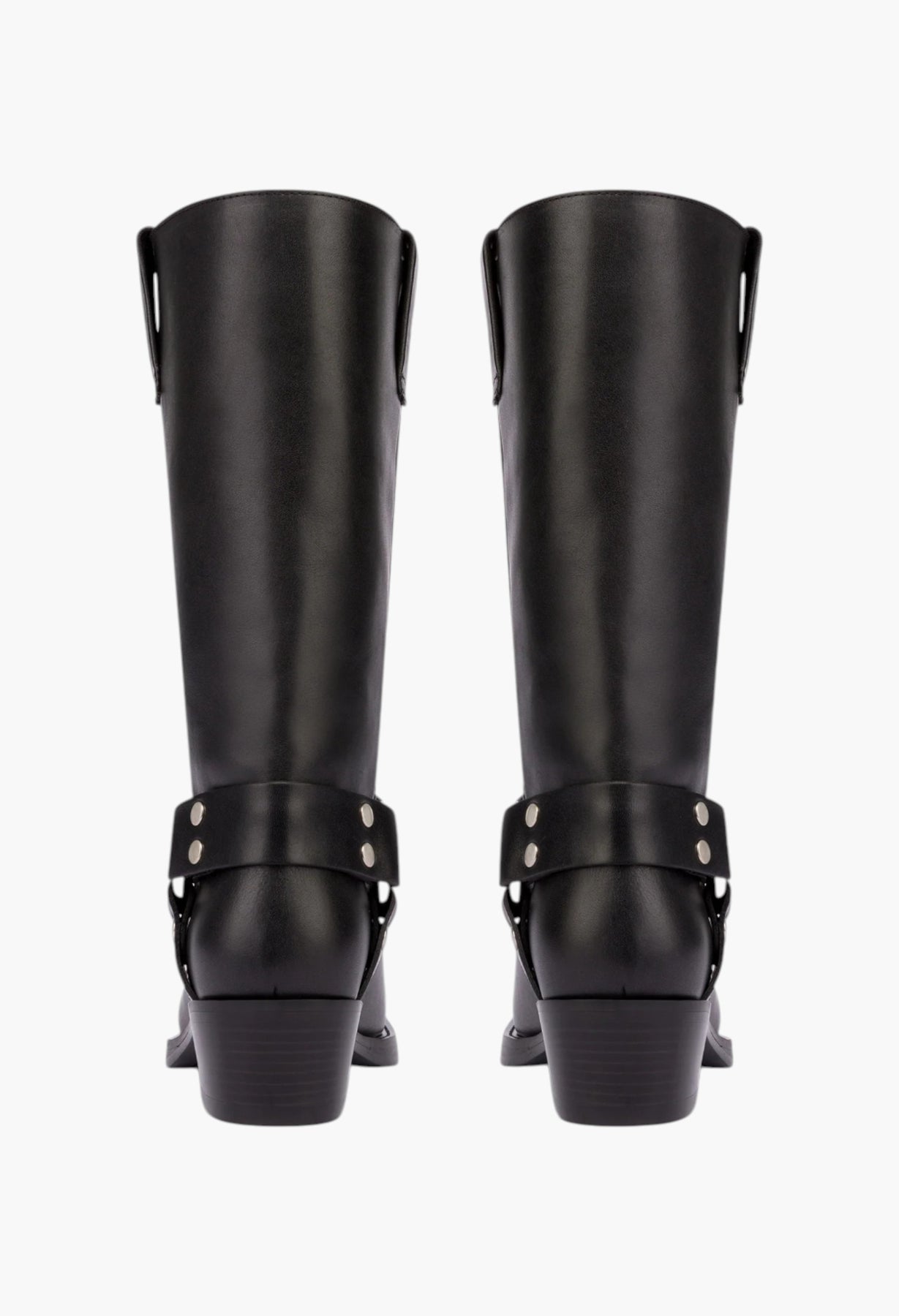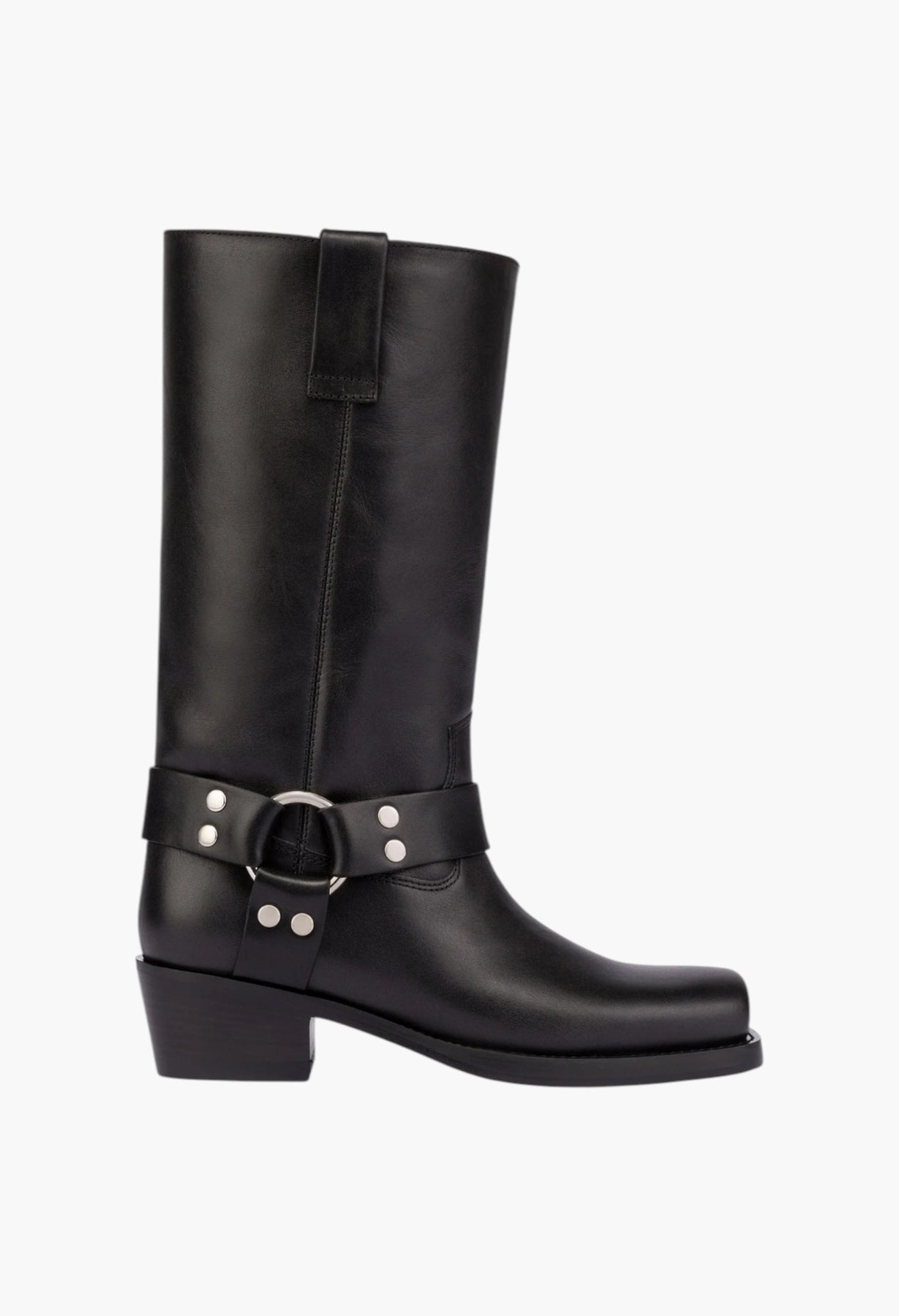 حذاء كاحل بمقدمة مربعة وكعب متوسط الارتفاع. متوفر باللون الأسود مع أحزمة سحب كلاسيكية وأجزاء معدنية حول الكاحل. صنع في إيطاليا من جلد ناعم.