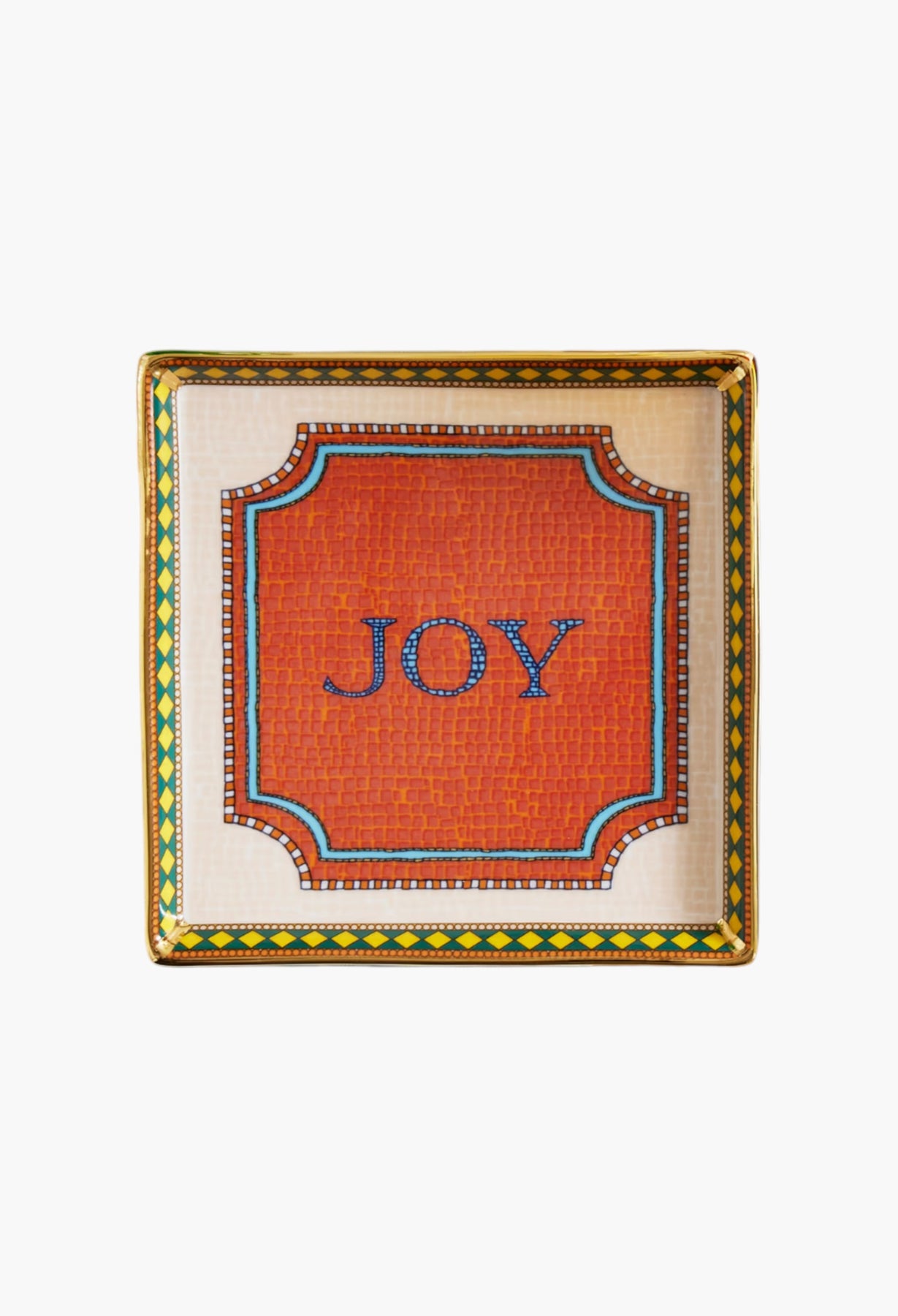 La DoubleJ's tray is ideal for serving light snacks or storing your favorite jewelry. It's been crafted in Italy from porcelain, painted with the brand's 'Joy Coral' motif and has a gold-plated border.