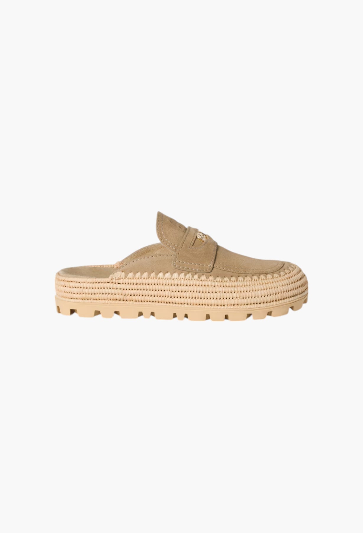 Ecru - Suede And Raffia Flatform Mules - GLAM MODA