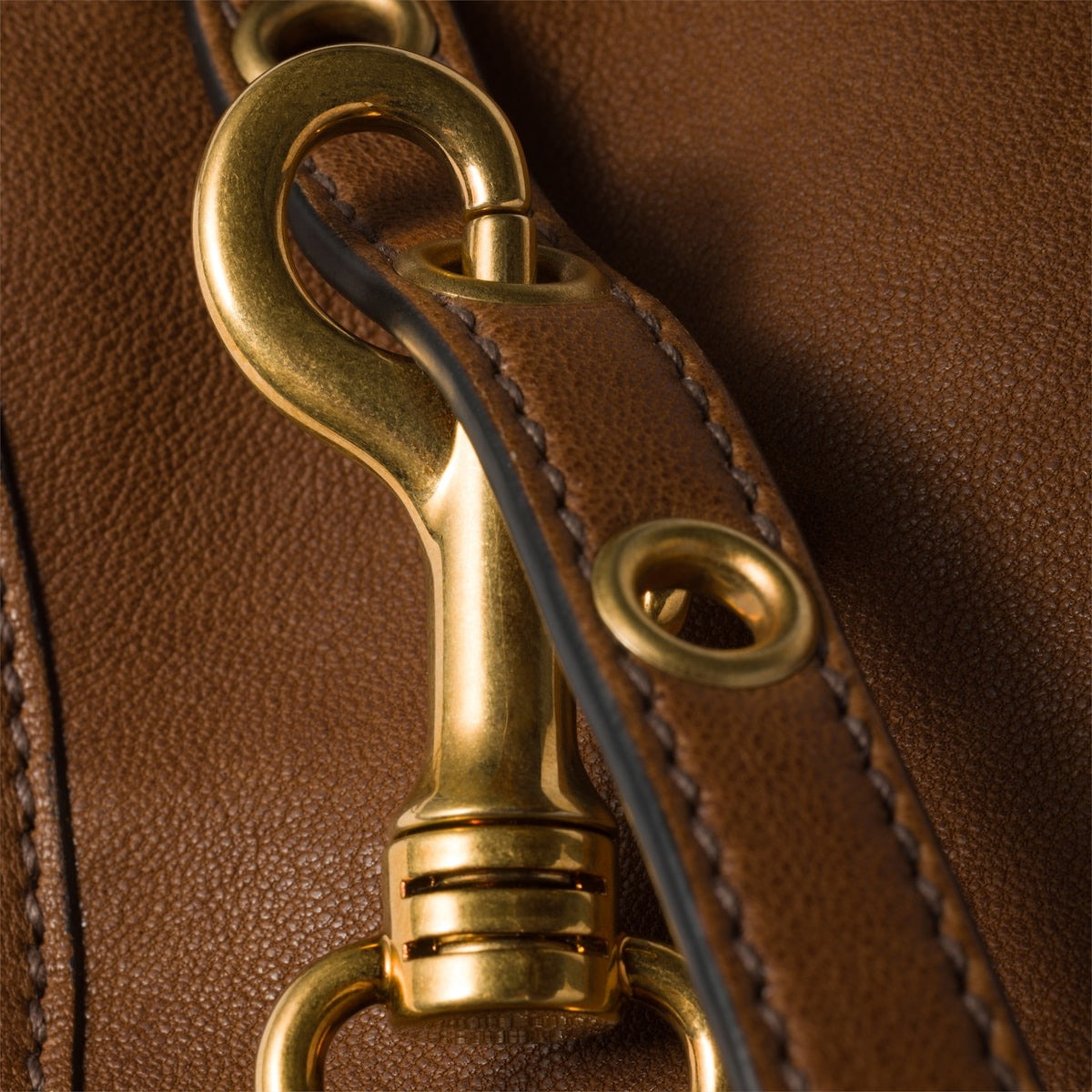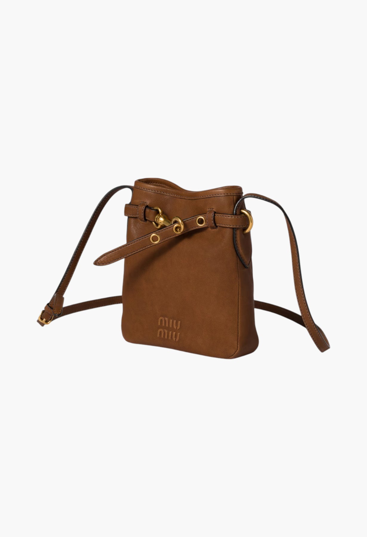 تتجلى تفاصيل الخطاف المفاجئ المستوحاة من حقيبة Aventure في تصميم هذه الحقيبة المصنوعة من جلد النابا وتسلط الضوء على الإشارات إلى أرشيف Miu Miu، مما يكمل المظهر بلمسة أيقونية.