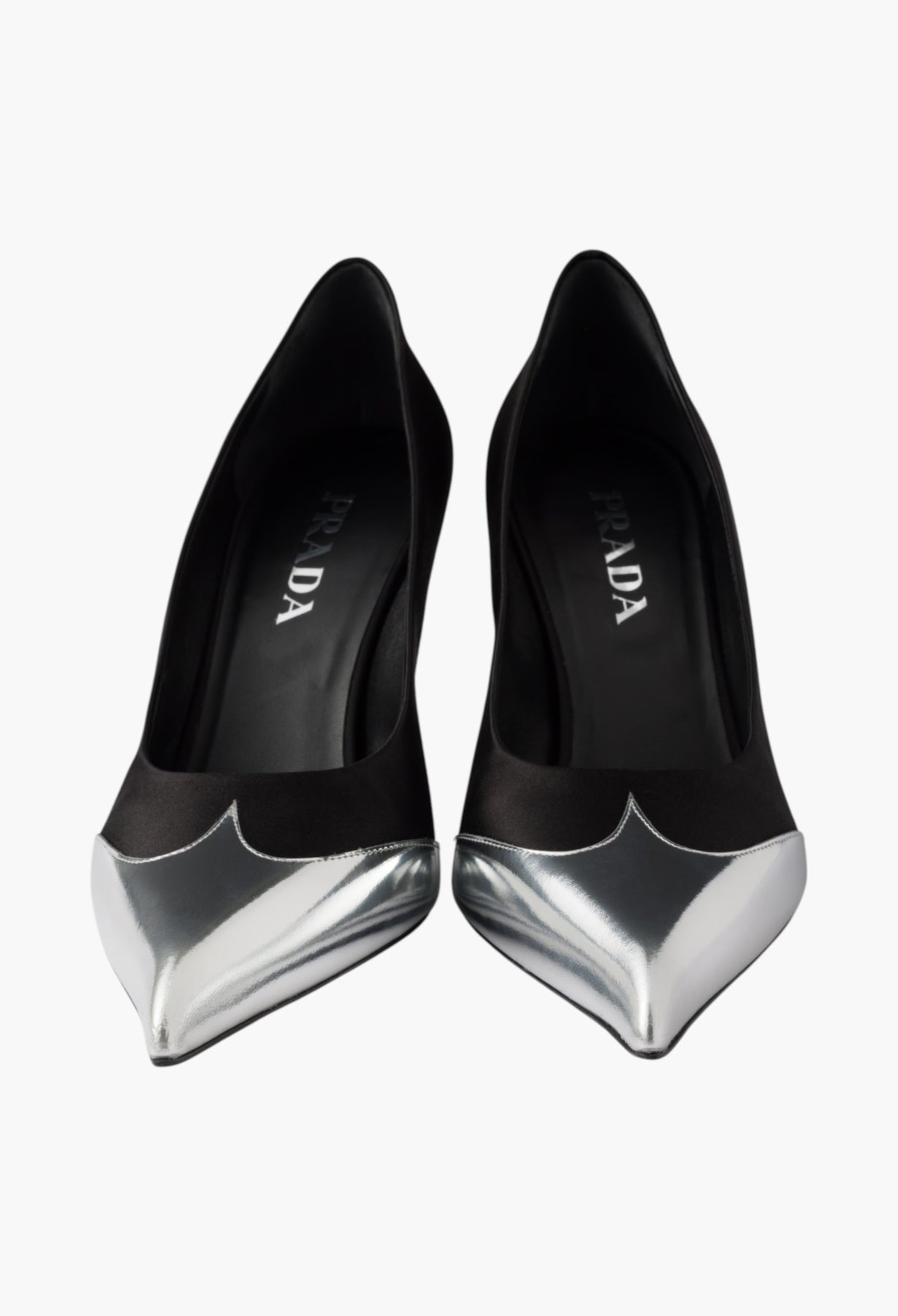 حذاء بكعب عالٍ من الجلد باللون الأسود والساتان المعدني