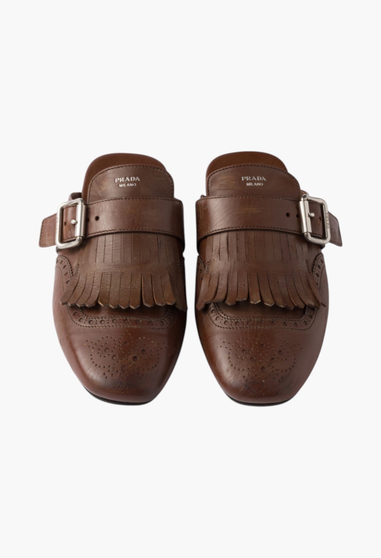 Cognac - Shuffle Fringed Leather Mules - GLAM MODA