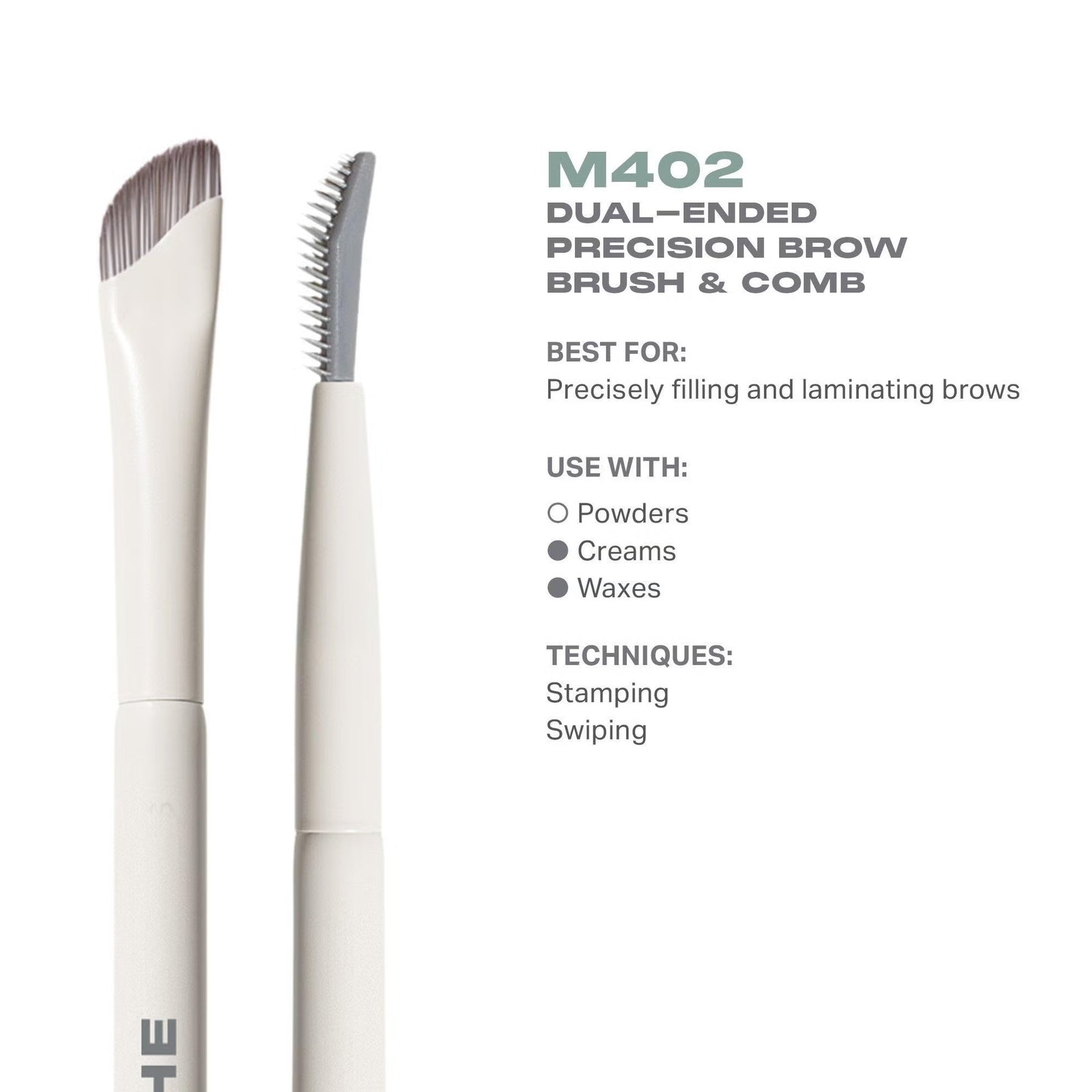 Fill, fluff, and softly laminate brows with Morphe's M402 Dual-Ended Precision Brow Brush & Comb. This tool features a precision brush to apply hairlike strokes, a comb to feather brows, and a paddle to press down brows for effortlessly lifted and tamed effects