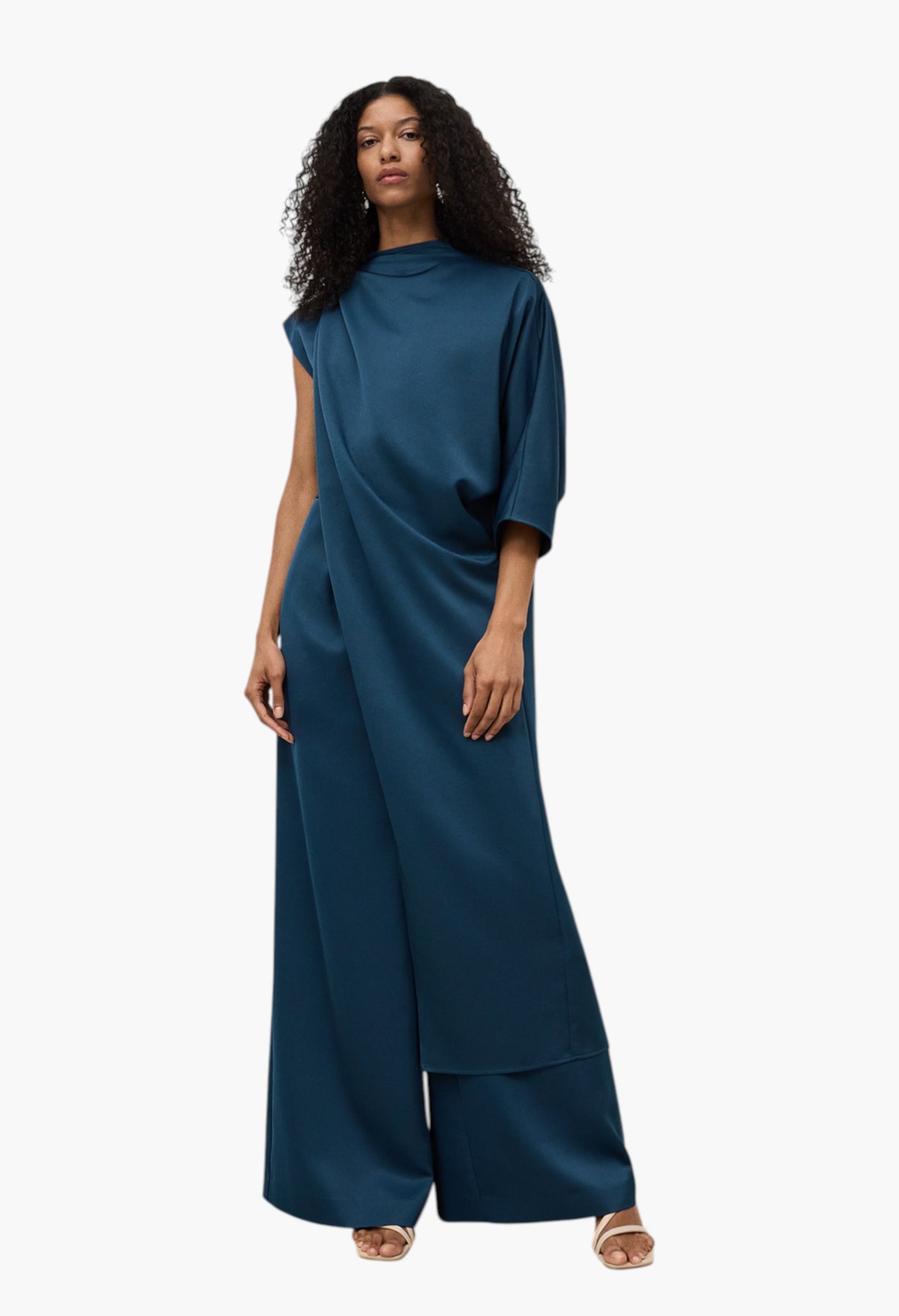 Recycled polyester blend long jumpsuit. Asymmetrical overlay cape fastened at the shoulder with a metallic applique. Zipper closure on the back.