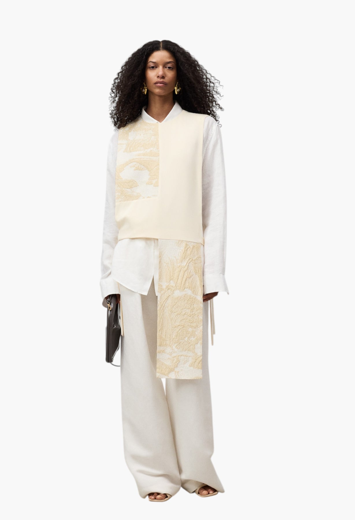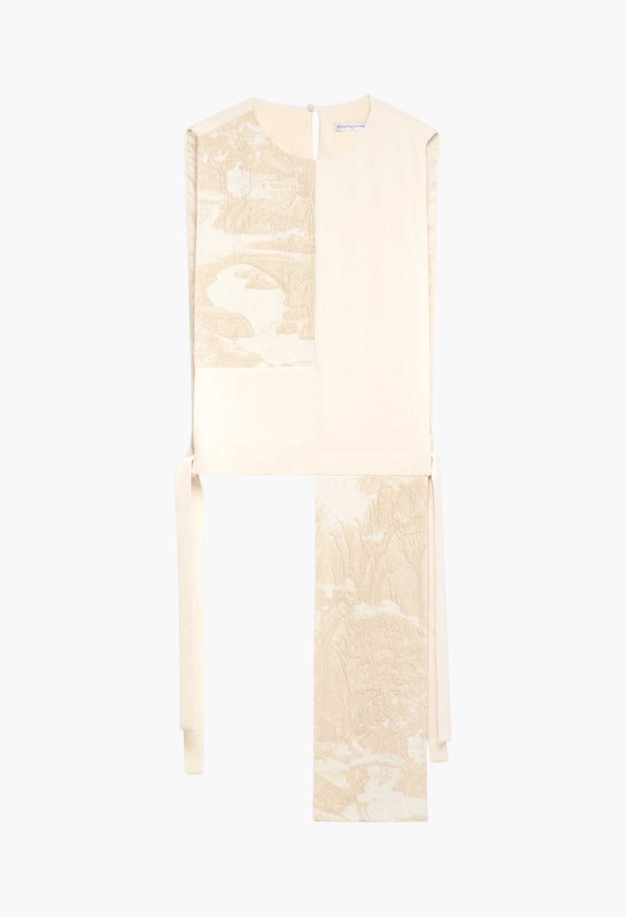 Asymmetrical vest with contrasting embossed panels. Side straps. Button closure on the back.