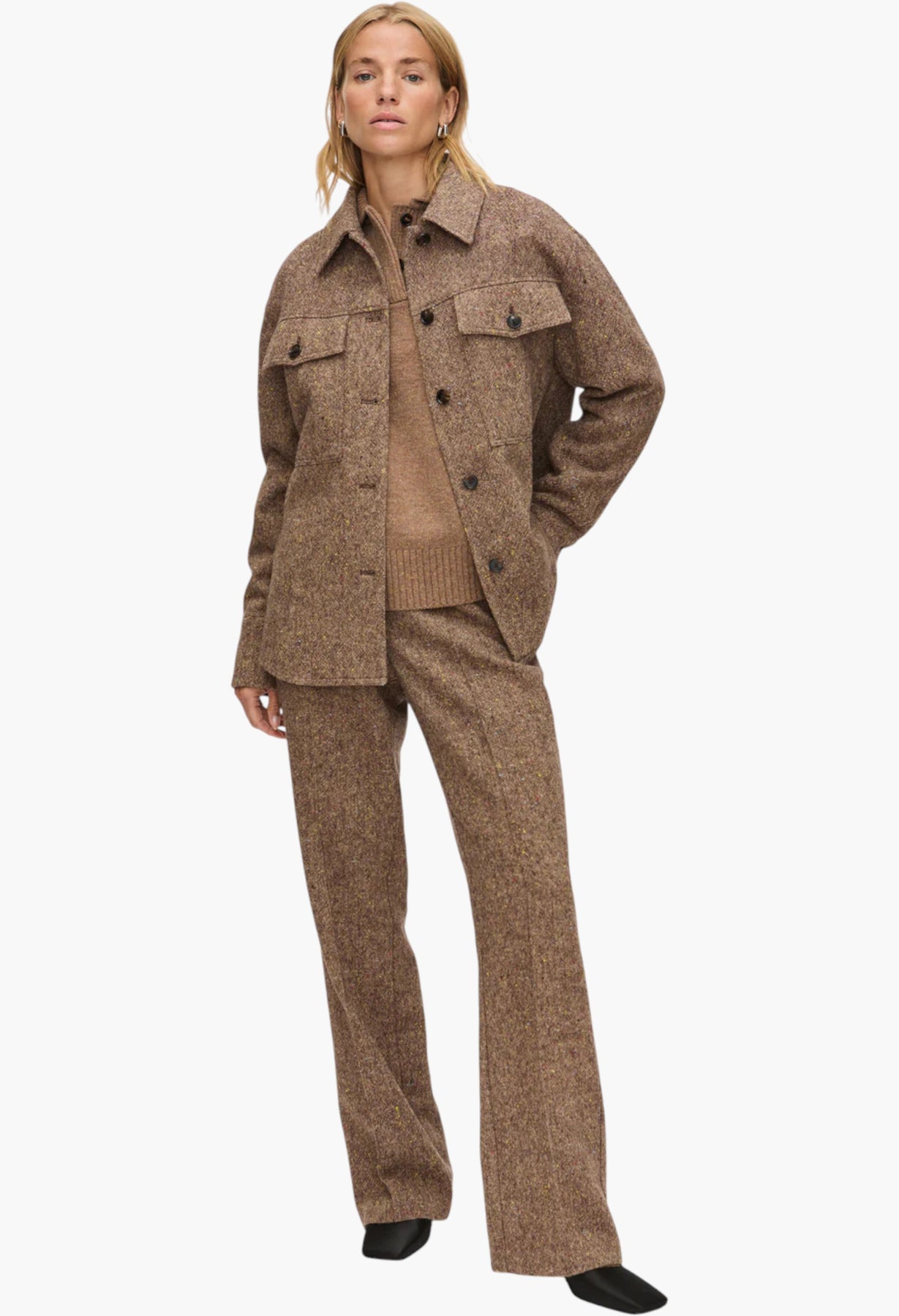 - Flecked boucle wool overshirt with front panel for tailored structure. Pair with the Lena trouser for a timeless co-ord.