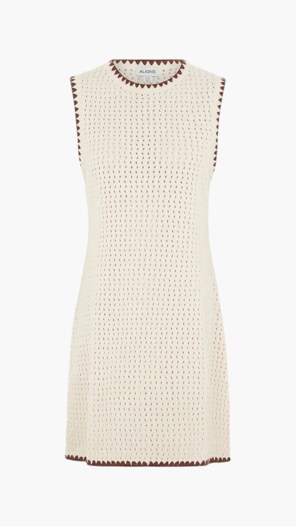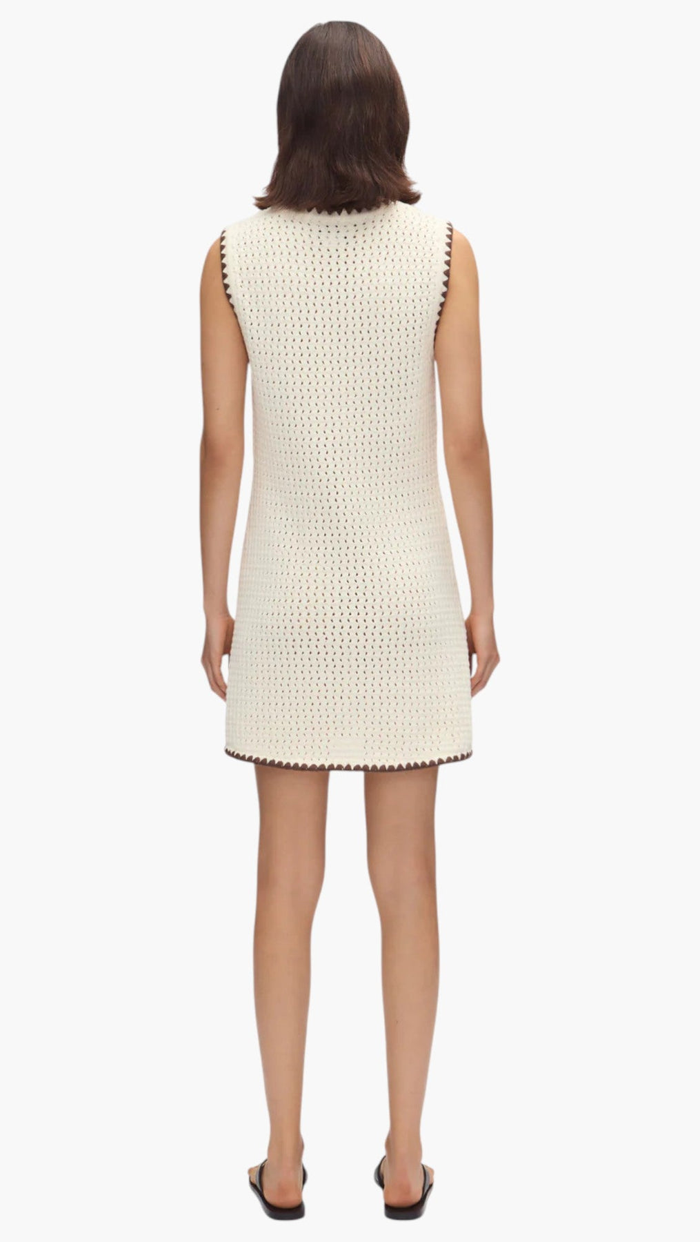 - Crochet knit mini dress with contrasting brown stitch detailing along the seams