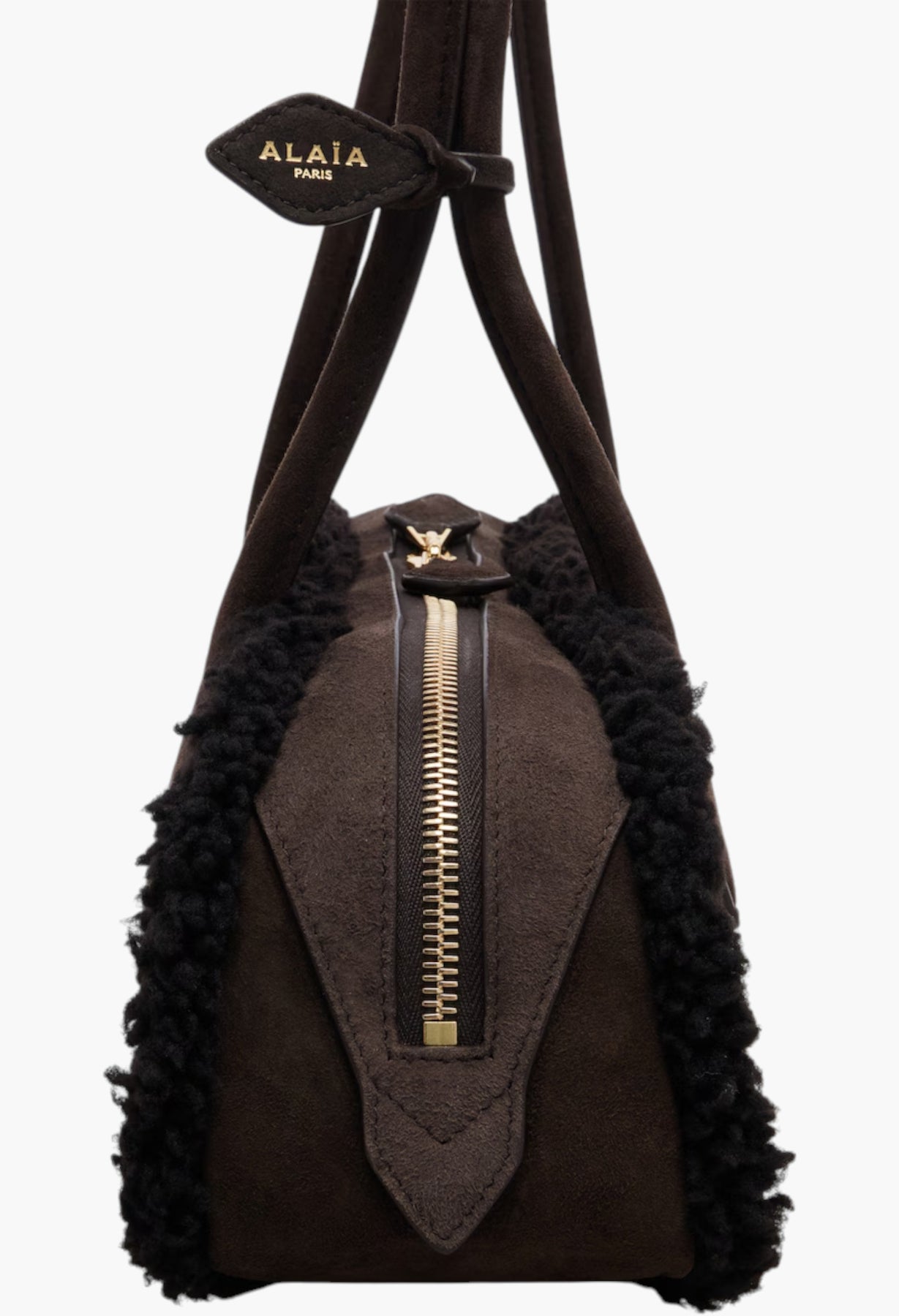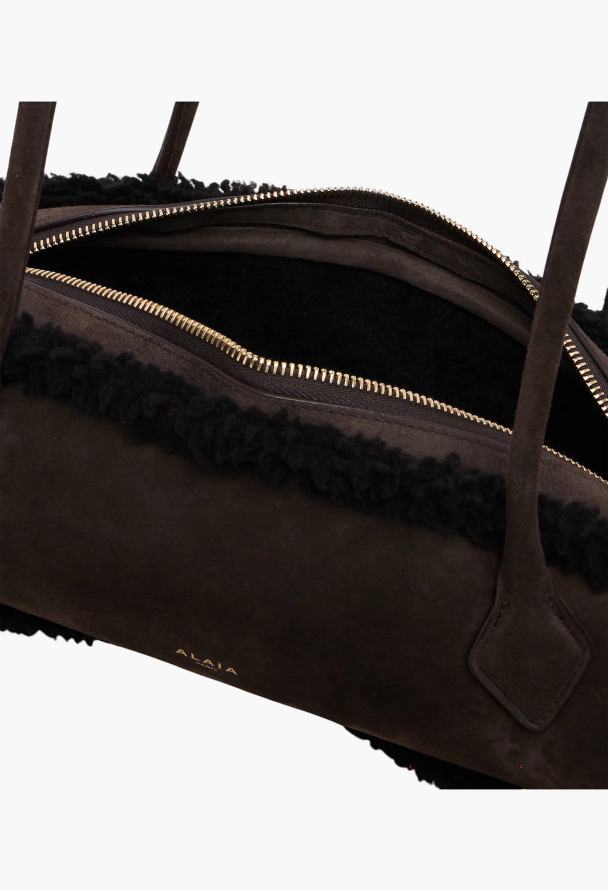 Boasting an instantly recognizable silhouette, Alaïa's Le Teckel shoulder bag is an iconic addition to your collection. Crafted from soft suede, this Medium iteration is trimmed with shearling and features elongated tubular handles and a zipped top.