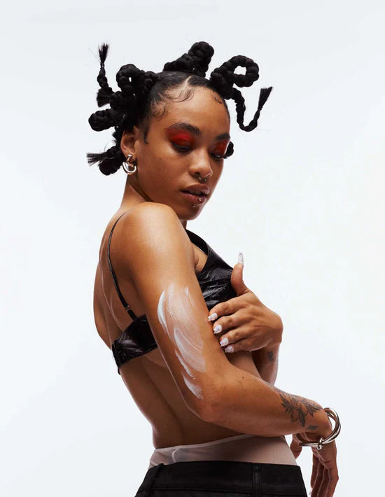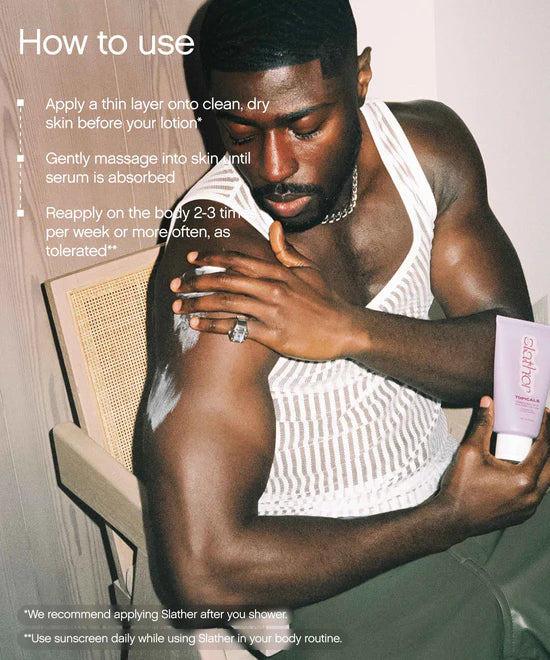 This fast-absorbing exfoliating body serum softens and hydrates skin overnight, smoothing bumps, textured and strawberry skin. Powered by a clinical formula of retinol, lactic acid, and urea, Slather effectively transforms uneven skin texture while leaving skin hydrated.