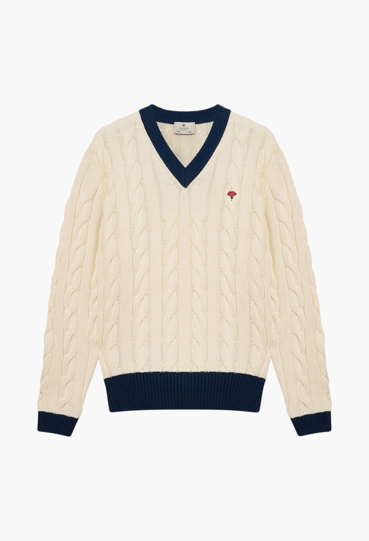 The Coup Cardigan is crafted from 100% cotton: natural, breathable, and soft against the skin. Its dense knit provides warmth and structure without compromising comfort. Ribbed details in navy at the collar, cuffs, and hem add a refined contrast, balancing classic form with a rebellious soul.