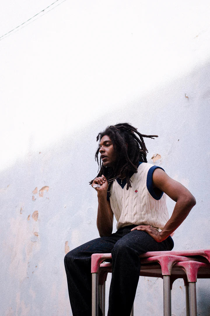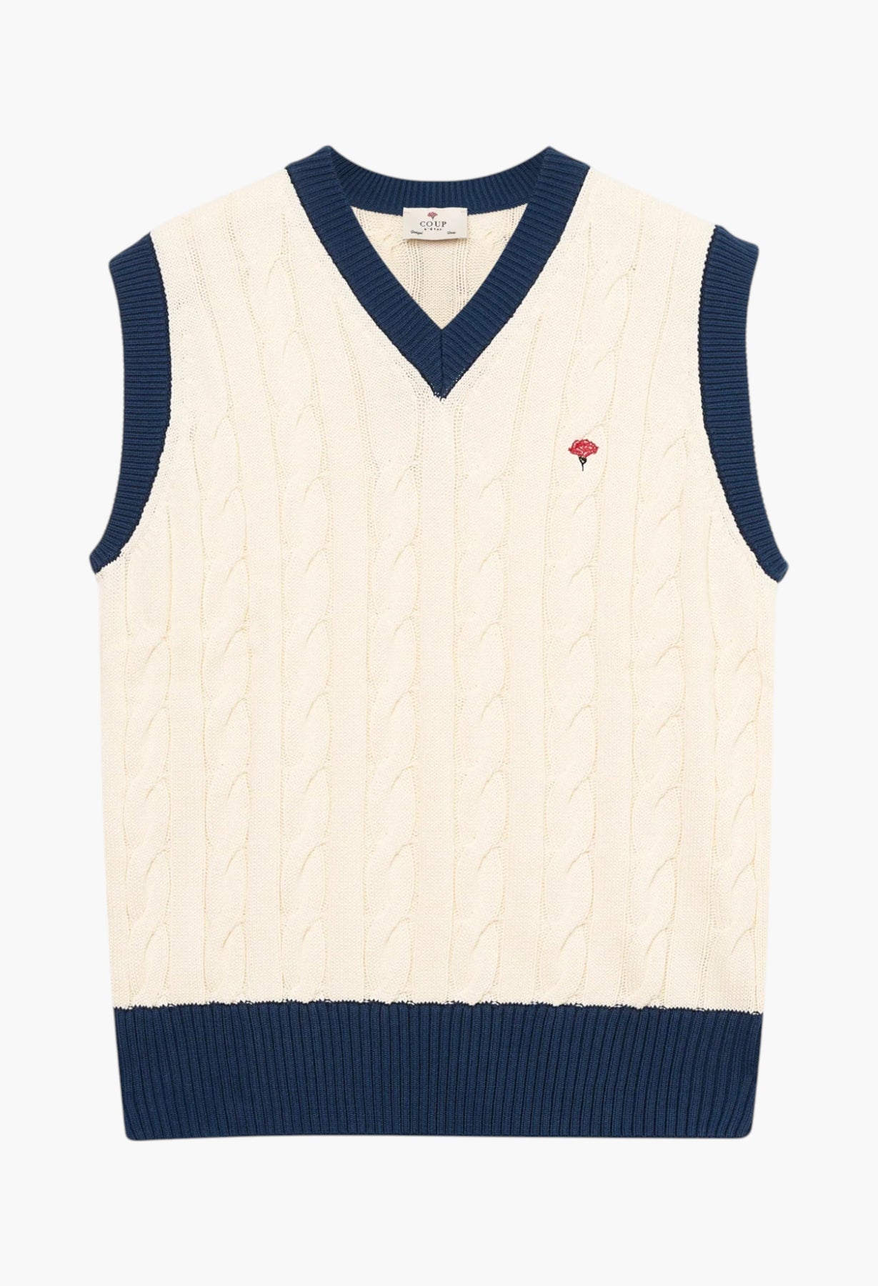 The Coup Vest blends comfort and elegance, crafted in off-white with navy ribbing that adds a touch of contrast and structure. The red carnation embroidered at the chest is the perfect finishing detail: bold yet understated.
