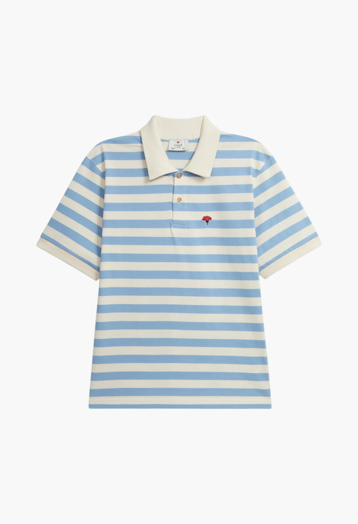 Classic lines, rebellious roots. This isn’t your grandpa’s polo. With baby blue and off-white stripes and a red carnation embroidered on the chest, it’s clean, sharp, and quietly subversive. The fit hits right between relaxed and refined: made to be worn like you mean it. Tradition? We’ll take it and twist it.