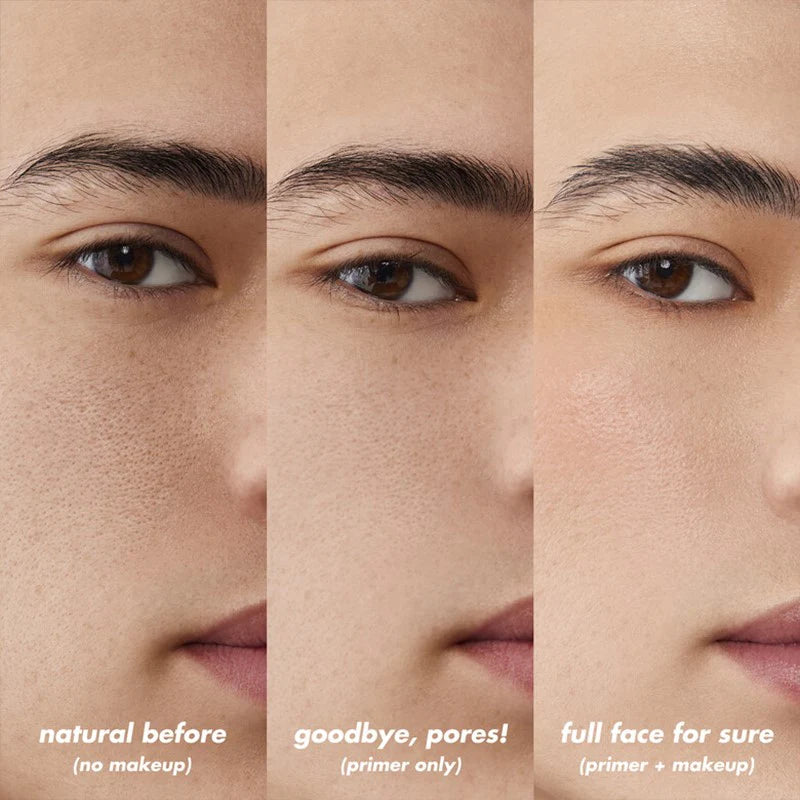 A lightweight liquid primer for a long-wear makeup application and a poreless-looking complexion.