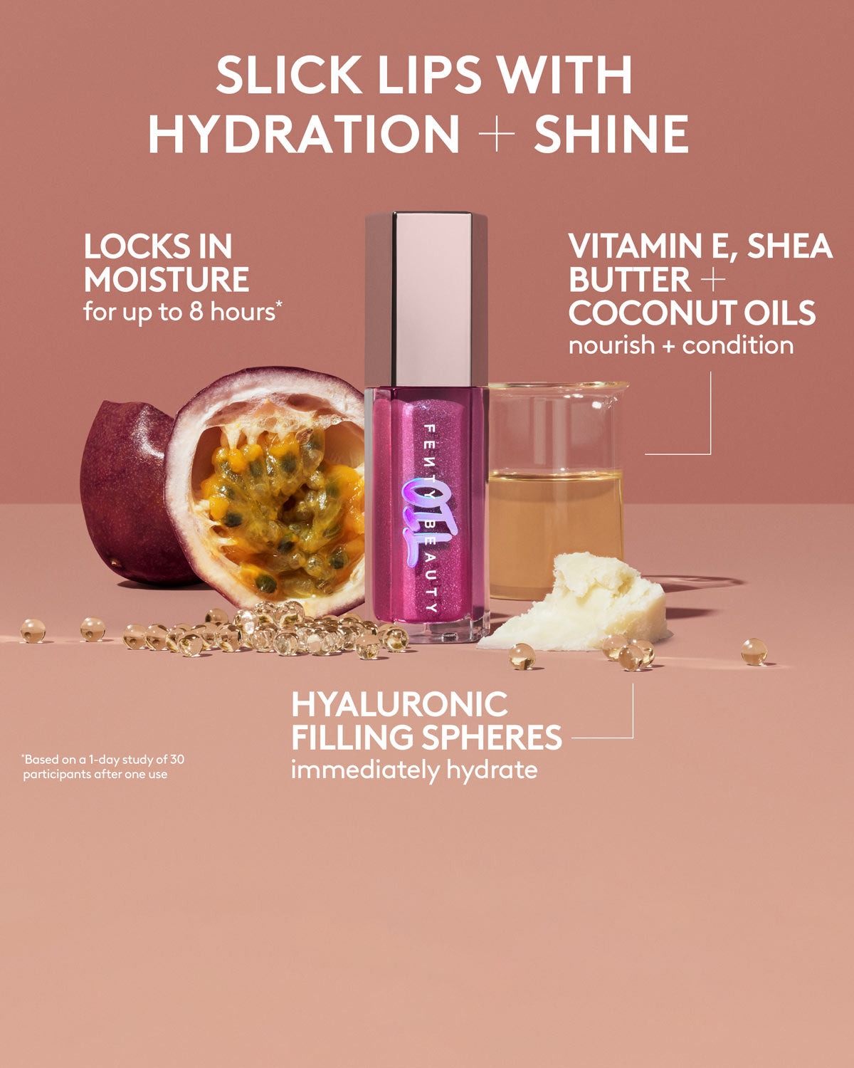Drip lips in a smooth, shimmering lip oil that locks in moisture for up to 8 hours.