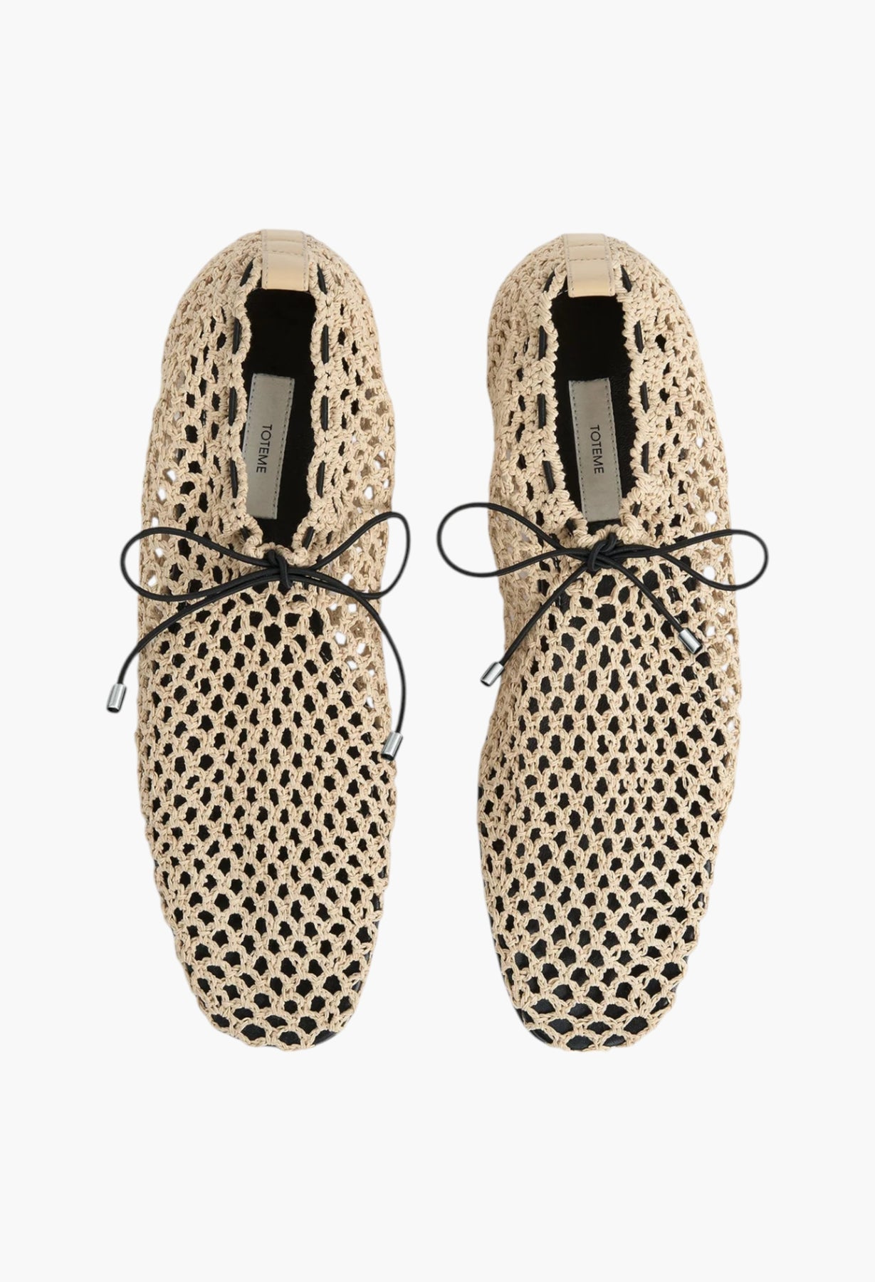 TOTEME ballerinas reworked in intricate crochet nodding to the collection's artisanal tone. They have an elasticated drawstring to secure the top edge and are set on a leather insole and sole. Wear them throughout summer with dresses.