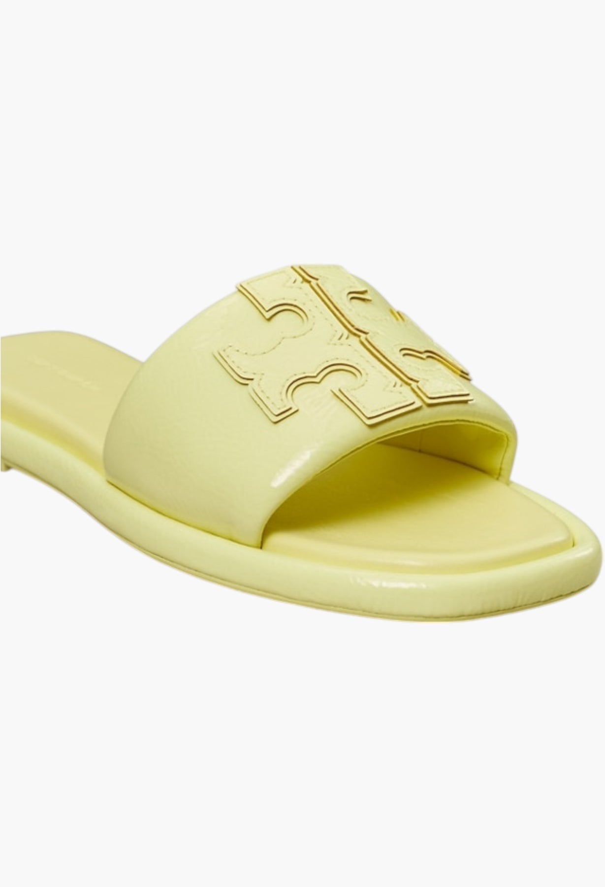 The classic sport slide, streamlined and refined. A trim band, padded in soft leather. A slim cushioned sole for comfort and flexibility. Finished with a Double T, stitched and framed in metallic leather.