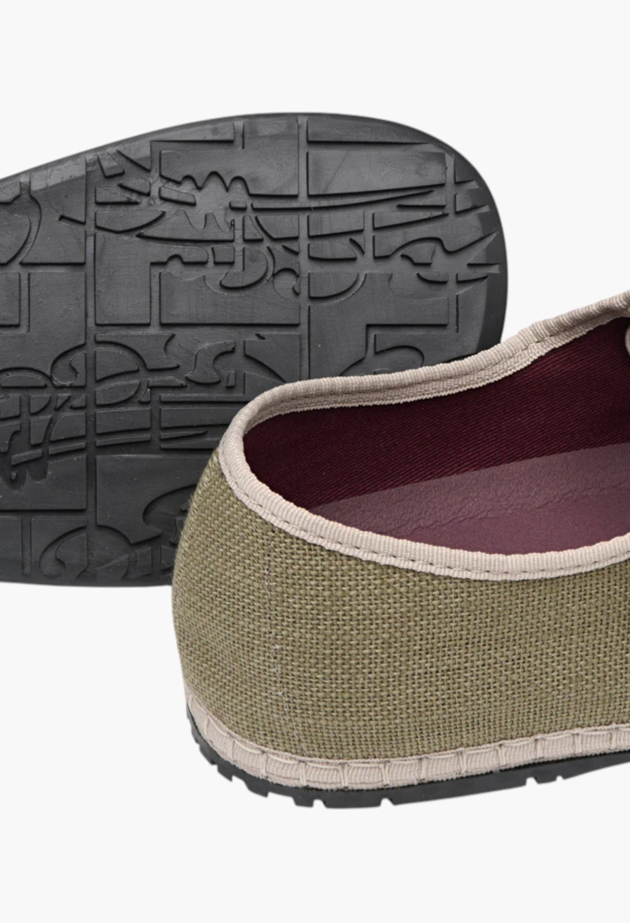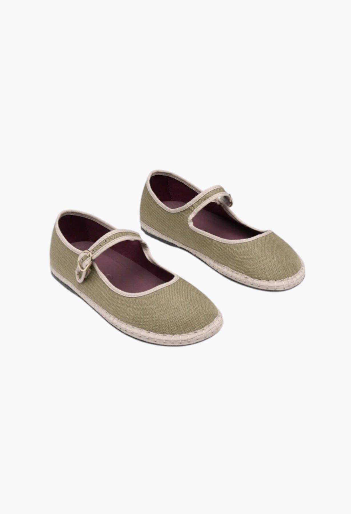 - Linen Mary Jane in green with beige piping and buckle closure.