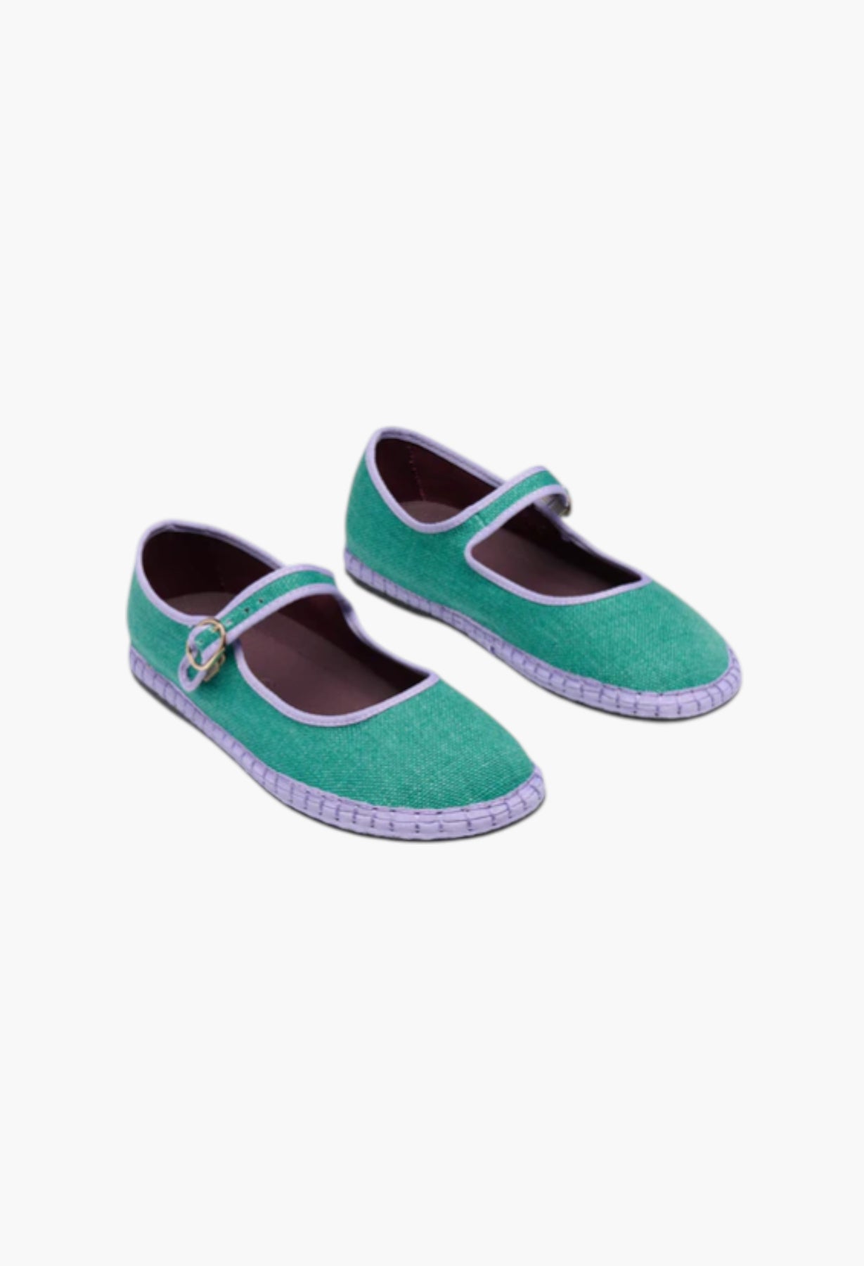 • Linen Mary Jane in green with lilac piping and buckle closure.