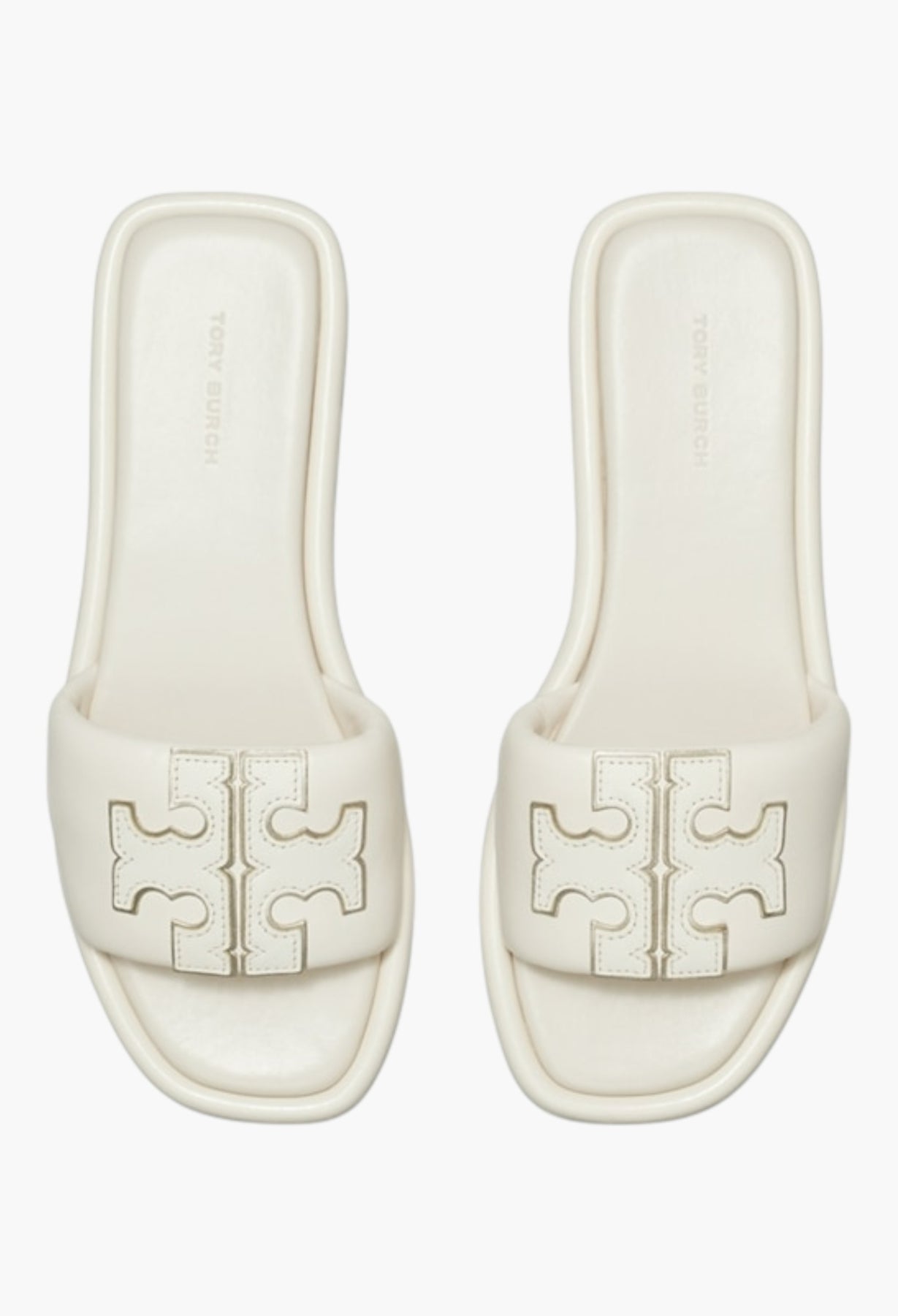 The classic sport slide, streamlined and refined. A trim band, padded in soft leather. A slim cushioned sole for comfort and flexibility. Finished with a Double T, stitched and framed in metallic leather.