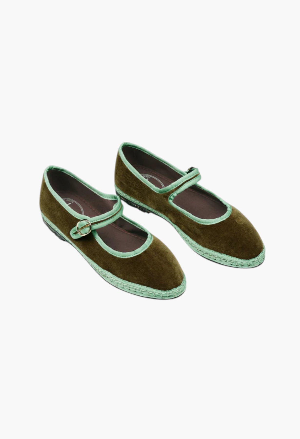 - Velvet mary jane in olive green with light green piping and buckle closure.