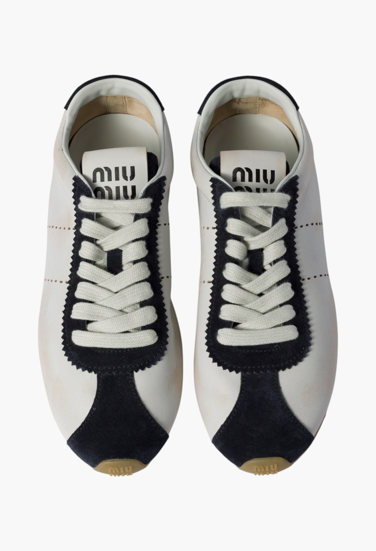 Plume sneakers stand out for their ultra-light design and innovative combination of materials like suede and bleached nappa leather, becoming the new emblem of Miu Miu's versatility and experimentation.