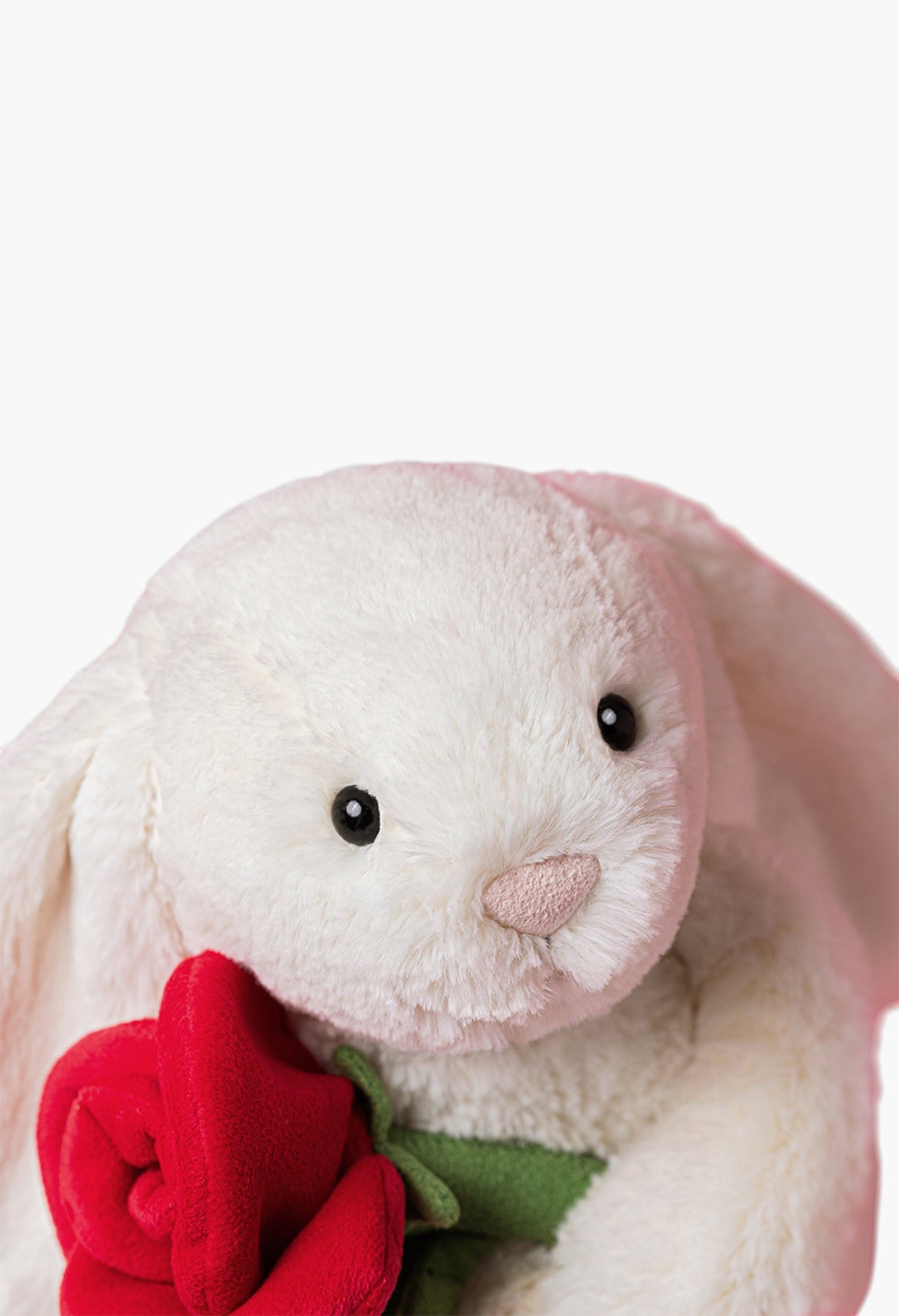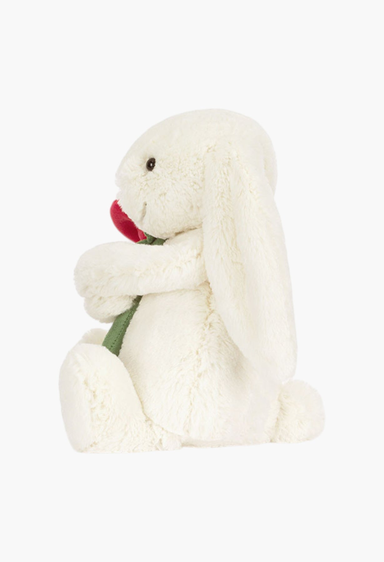 Calm, un-rushable Cream Bunny with Rose takes the time to notice the beauty all around her.