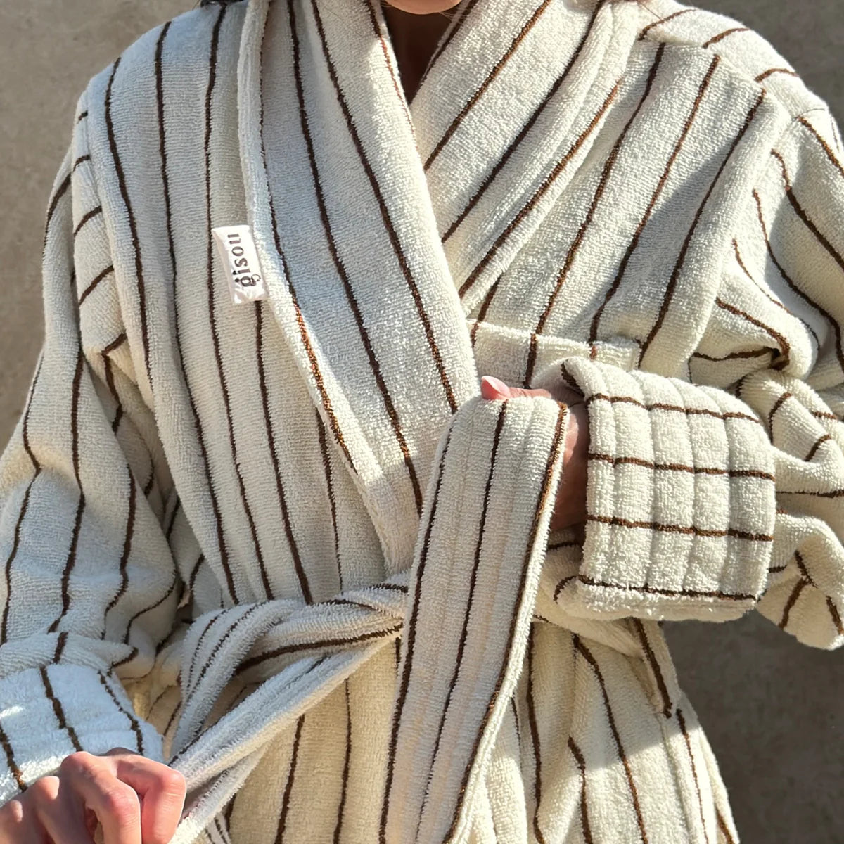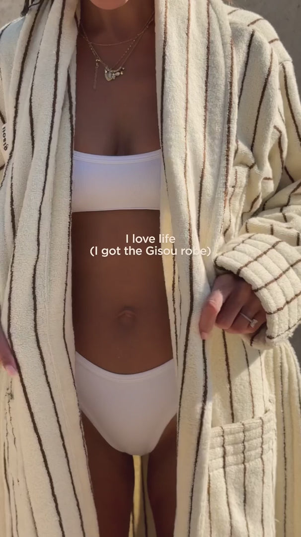 Negin Mirsalehi wears our iconic brown striped bath robe. Get yours when you shop The Honey Gloss Pamper Package.